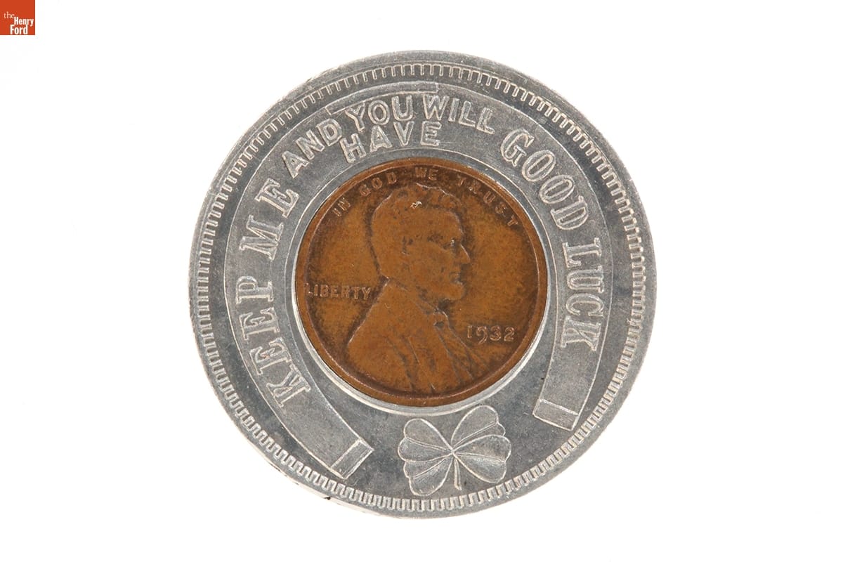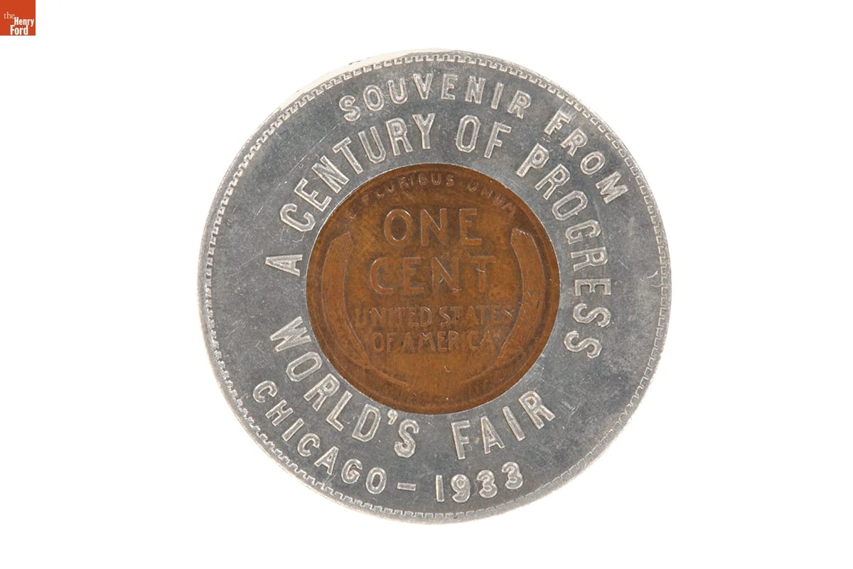 Chicago's 1933-34 Century of Progress Exposition used the theme of progress to buoy national optimism during the darkest years of the Great Depression. Many fairgoers returned home with mementos, such as this keepsake medal featuring a penny for "good luck."