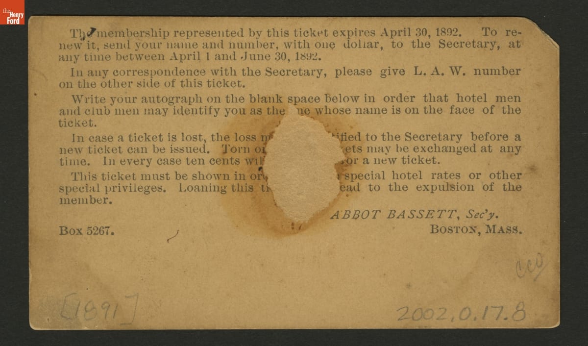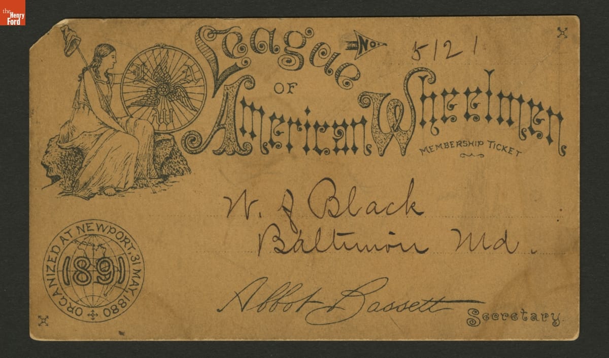 Members of the League of American Wheelmen were early advocates of good roads and the rights of cyclists. The organization issued membership cards to cyclists in good standing. According to this 1891 card, members also received special hotel rates and other privileges.