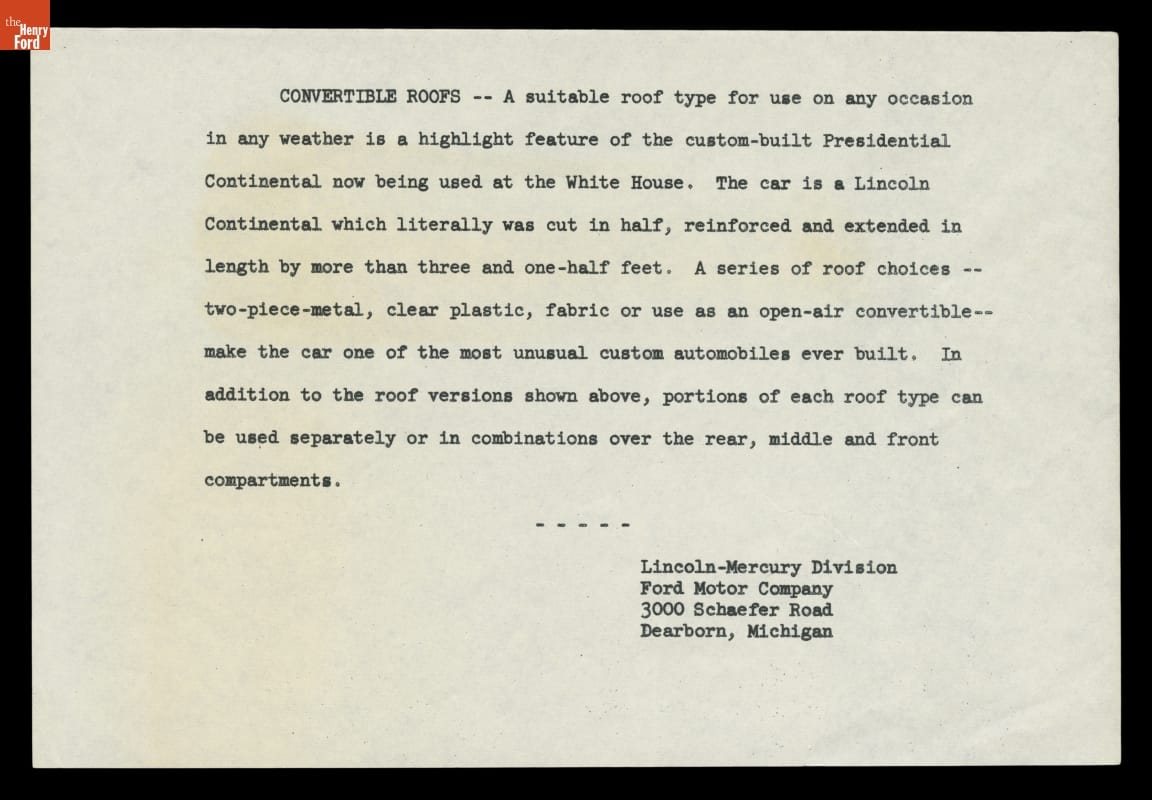 Three Convertible Roof Options for Lincoln Continental Presidential Limousine, 1961
