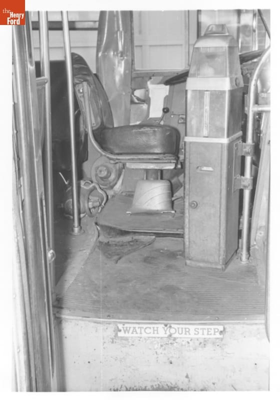This late-1950s photograph shows the driver's seat and coin box on the Montgomery (Alabama) City Bus Lines. While riding a Montgomery bus in 1955, Rosa Parks refused to give up her seat to a white man, leading to a widespread bus boycott by African Americans.
