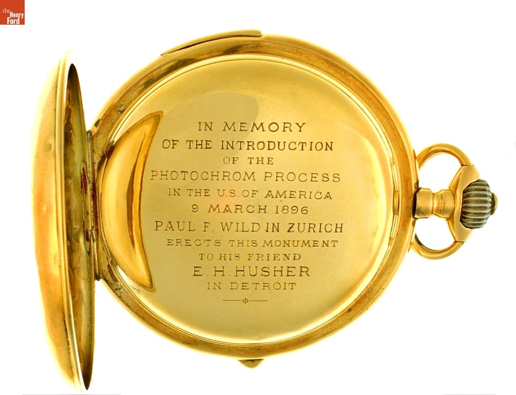 Engraved Initials on cover: EHH Engraving inside watch cover: In Memory of the Introduction of the Photochrom Process in the U.S. of America 9 March 1896 Paul F. Wild in Zurich Erects this Monument to his Friend E. H. Husher in Detroit.