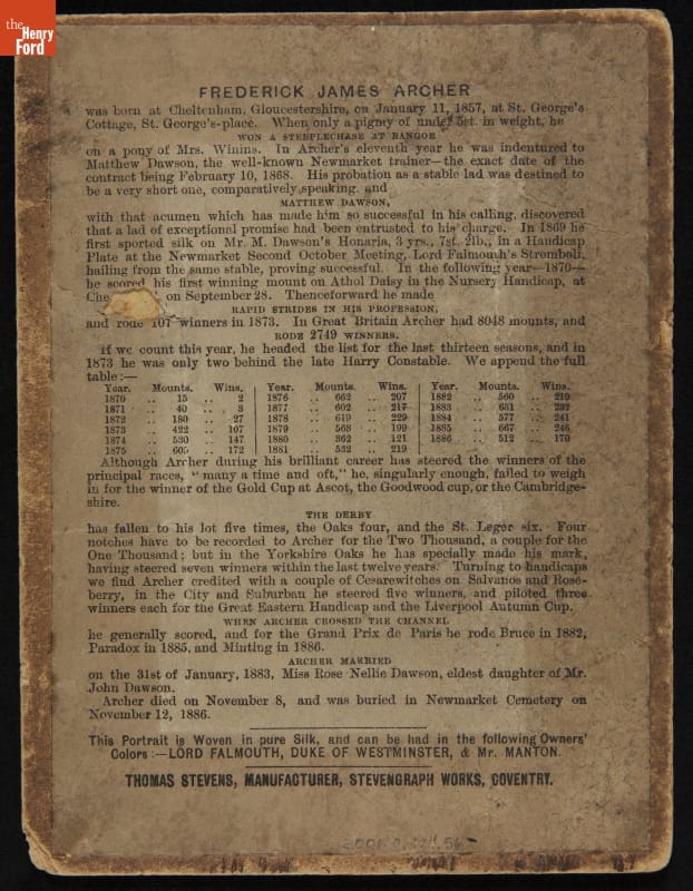 Stevengraph Portrait, "The Late Fred. Archer," 1886
