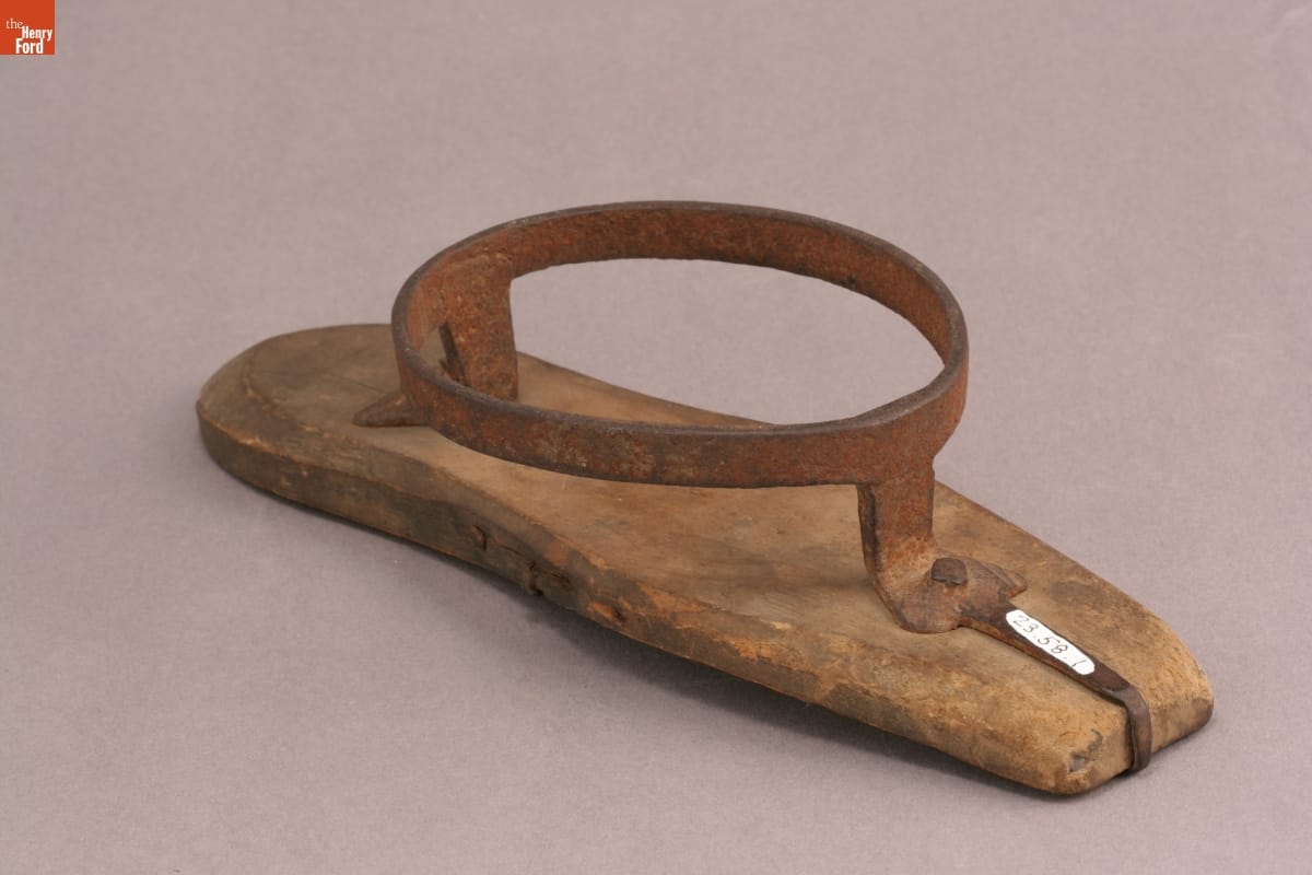 Residents in early 19th century cities might attach a patten like this to the bottoms of their thin leather and fabric shoes before going for a walk. The iron ring raised the foot off the wet pavement and carried the pedestrian safely through any mud-filled puddles -- keeping both foot and shoe clean and dry.