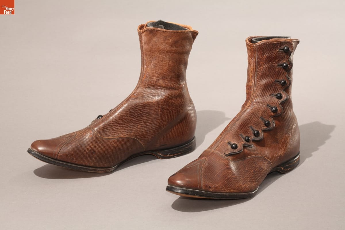 Walking is the oldest form of transportation. A pair of walking shoes served a 19th-century American through city and country. By the late 1800s, shoes were increasingly made in factories instead of by hand, at half the cost. These factory-made, brown leather boots were made for a woman.