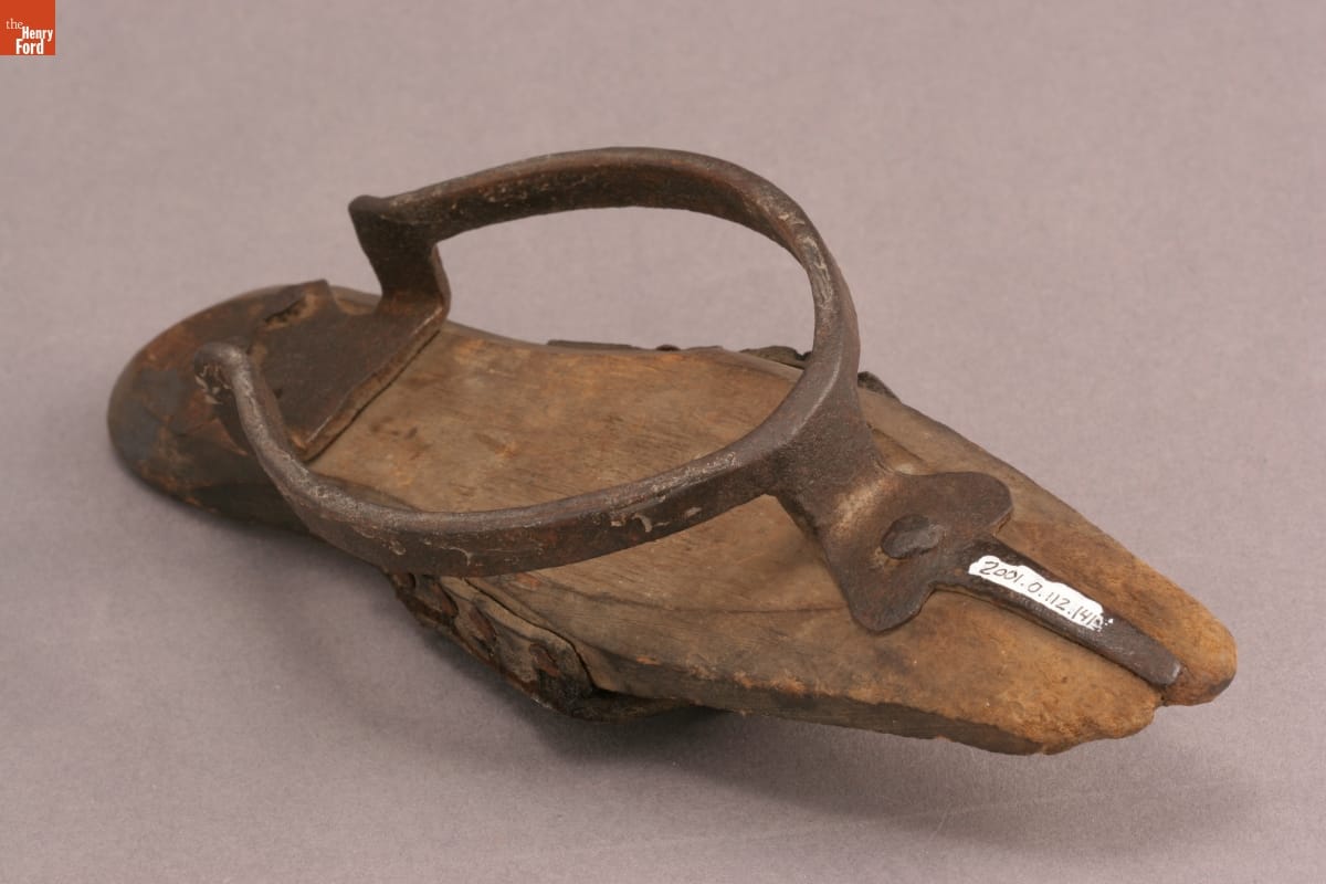 Residents in early 19th century cities might attach a patten like this to the bottoms of their thin leather and fabric shoes before going for a walk. The iron ring raised the foot off the wet pavement and carried the pedestrian safely through any mud-filled puddles -- keeping both foot and shoe clean and dry.