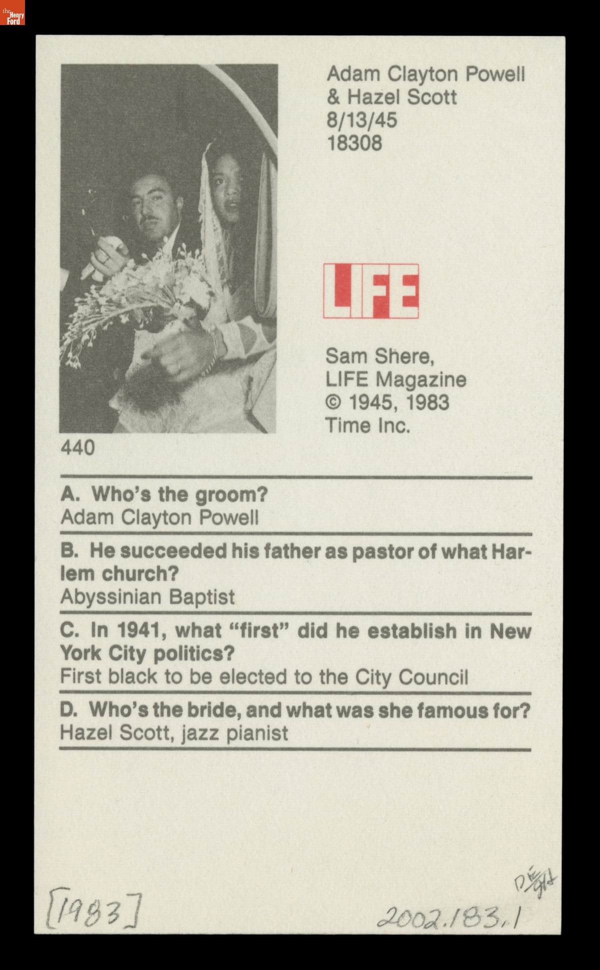 Adam Clayton Powell & Hazel Scott, Information Card, 1983