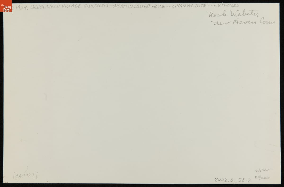Noah and Rebecca Webster built their comfortable home in a fashionable middle-class neighborhood of New Haven, Connecticut, during the early 1820s. They lived only a few blocks from New Haven's town green and very near Yale College. The house, shown here (far right) about 1927, was situated close to the street, as were most urban homes of the early 19th century.