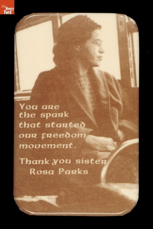 On December 1, 1955, Rosa Parks refused to give up her seat to a white man on a bus in Montgomery, Alabama. Her courageous act of protest was considered the spark that ignited the Civil Rights movement. For decades, Martin Luther King Jr.'s fame overshadowed hers. But by the time of this button, Parks was beginning to receive long-overdue recognition.