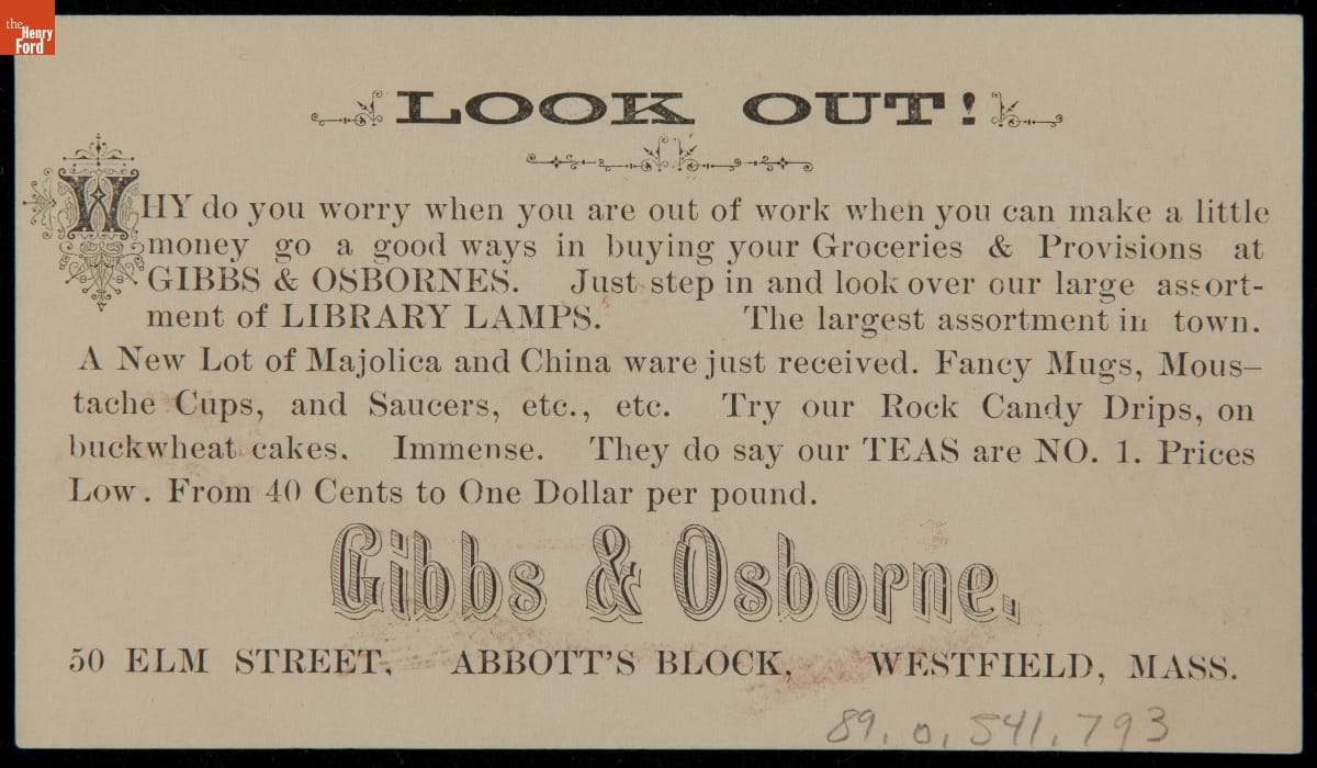In the last third of the nineteenth century, an unprecedented variety of consumer goods and services flooded the American market. Advertisers, armed with new methods of color printing, bombarded potential customers with trade cards. Americans enjoyed and often saved the vibrant little advertisements found in product packages or distributed by local merchants. Many survive as historical records of commercialism in the United States.