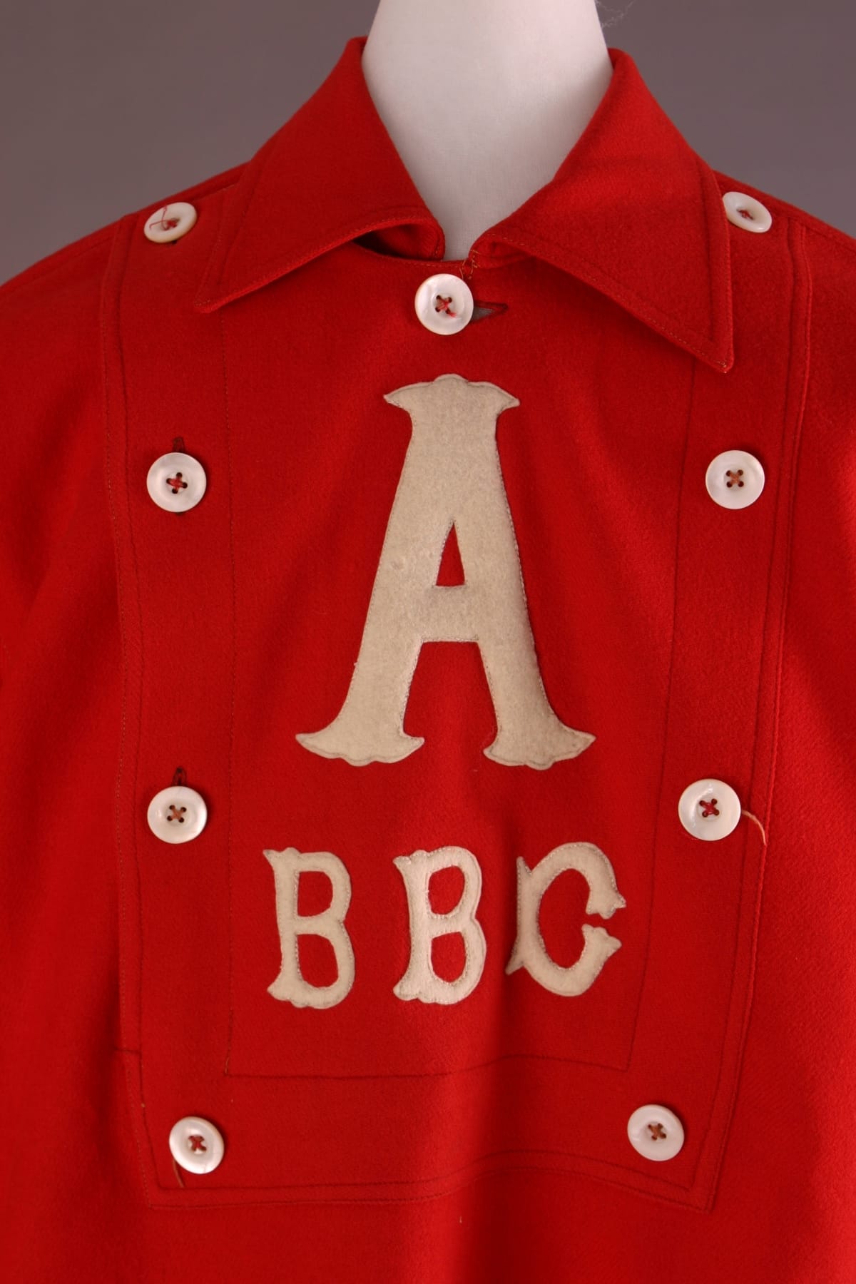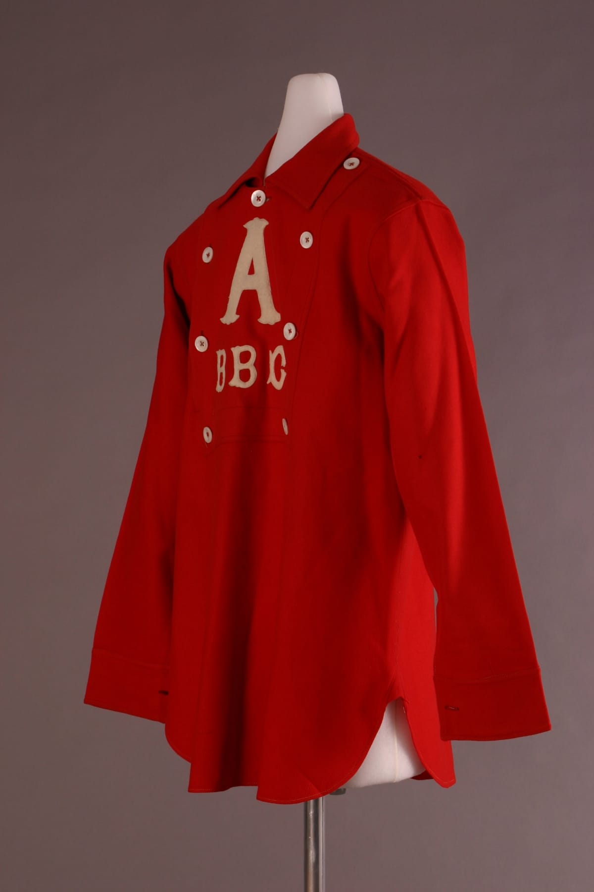 In the decades following the Civil War base ball clubs rapidly came to represent a community's identity and honor. Players donned colorful uniform shirts to make the team readily visible to its supporters and opponents alike. The oversized "A" on this bright red wool shirt would have stood for the name of the community, company, school or club.