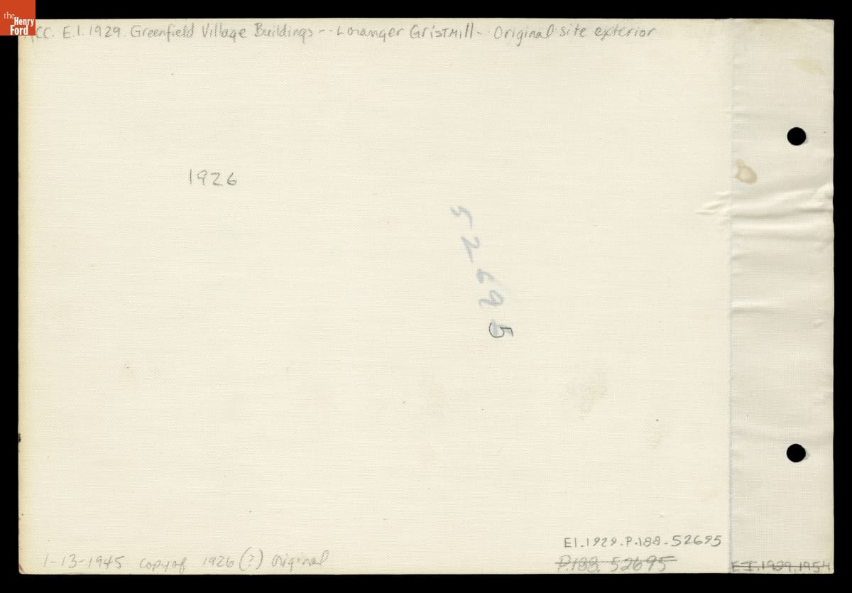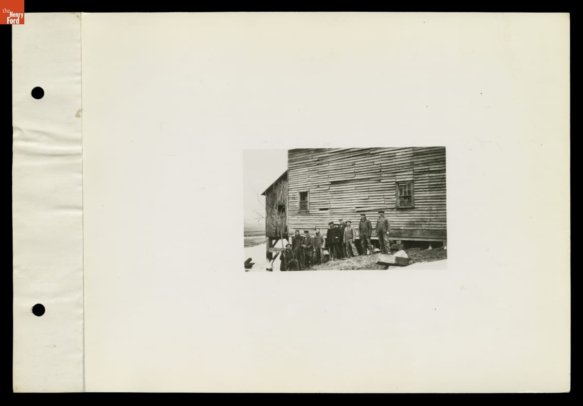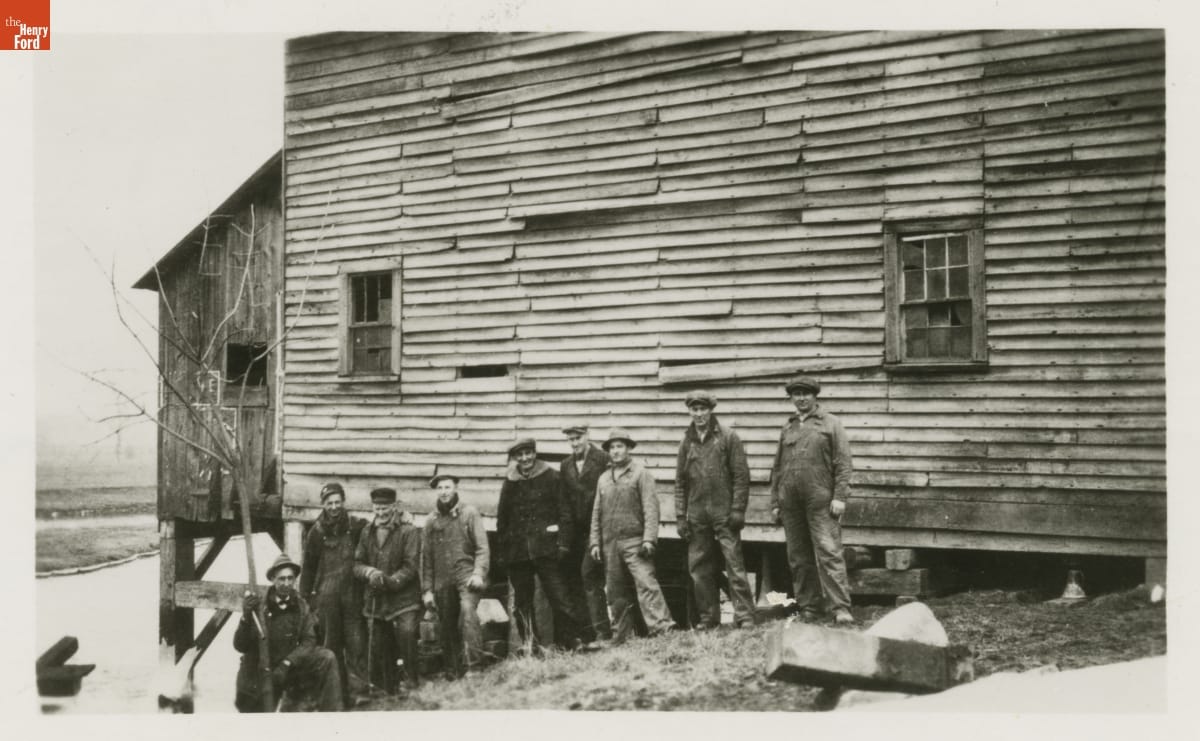 Loranger Gristmill was built in 1832 on Stoney Creek in Monroe, Michigan. It incorporated a sophisticated conveyor system, developed by Oliver Evans in the late 1700s, that moved grain through the building to be ground into flour or animal feed. Henry Ford acquired the mill in 1928. This may be an image of the crew sent to disassemble and relocate the mill to Greenfield Village.