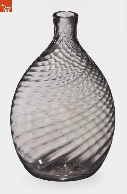 American glass factories produced flasks, like this one, from the late 1700s well into the mid-1800s. The pint-sized flask could hold water but more likely contained alcoholic beverages. Its textured decorative exterior -- formed when the hot glass was dipped into a pattern mold before it was blown -- made the flask easier to grasp. And its flattened shape fit nicely into pockets providing ready access to the liquid refreshment.