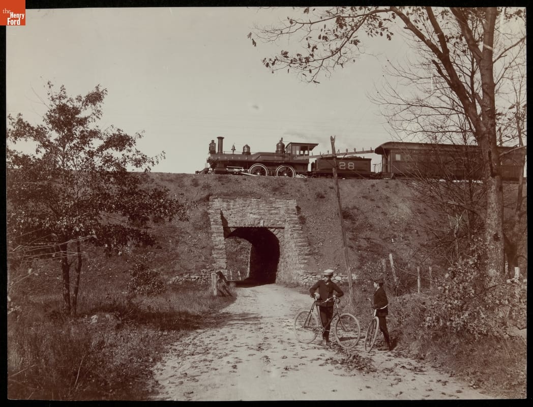 This photograph shows two popular modes of transportation available around 1900. A person could travel long distances by train or take a short leisurely ride on a bicycle.