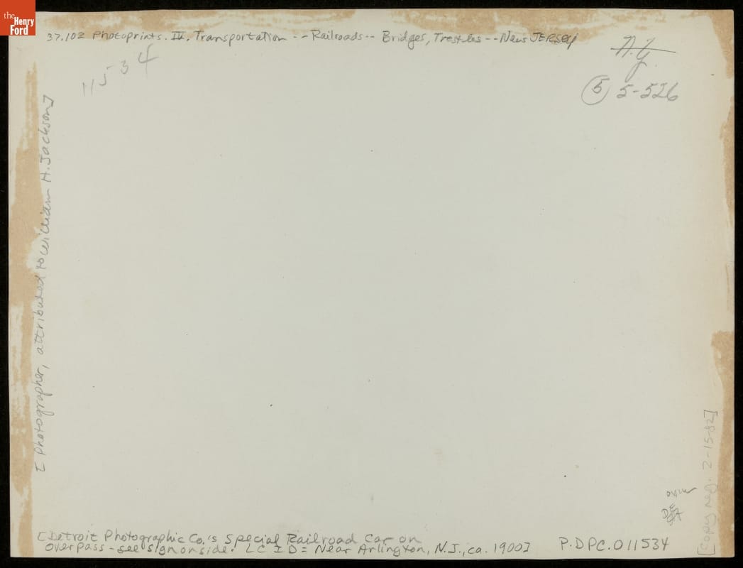 Handwritten in pencil on verso: Detroit Photographic Co.'s Special Railroad Car on overpass- see sign on side Written on verso center bottom in pencil: LC ID: Near Arlington, N.J., ca. 1900 On side in pencil: Photographer, attributed to William H. Jackson