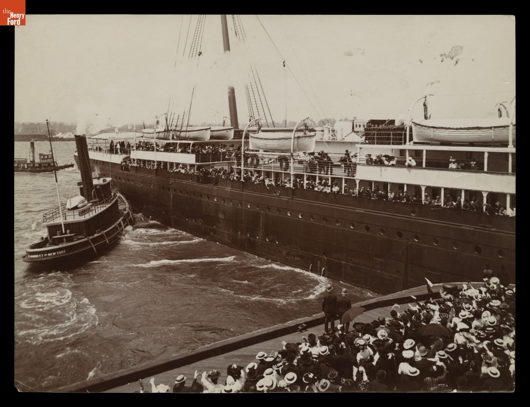 "Farewells," Tugboat Pushing Off White Star Line Ocean Liner SS Majestic, circa 1903