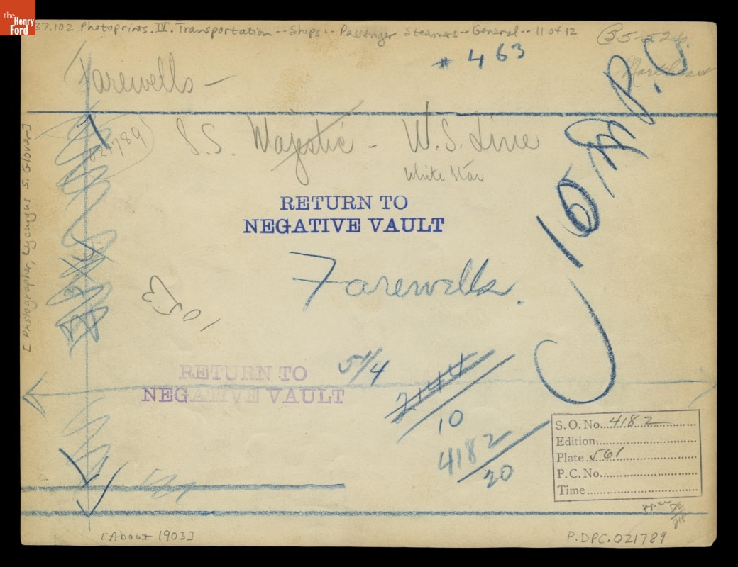 On verso: In pencil: Farewells, S.S. Majestic-- W.S. Line White Star 1053 021789 /.