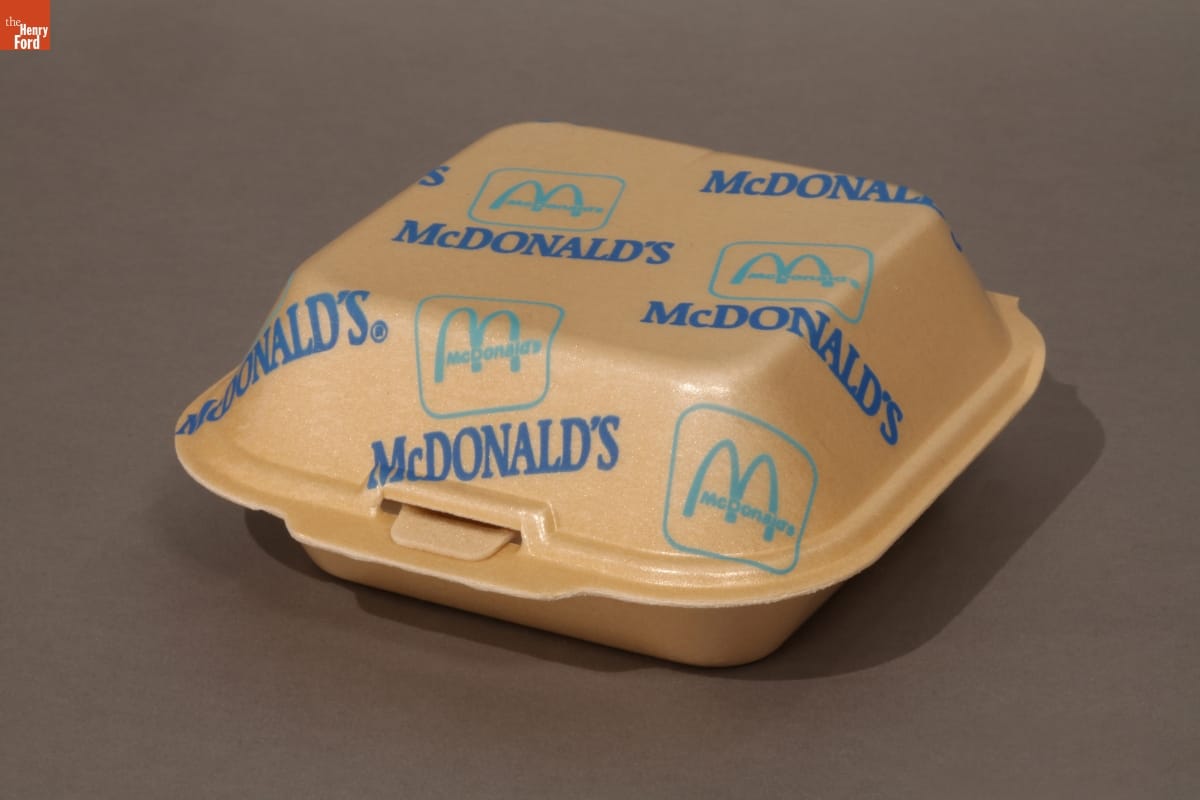 McDonald's phased out polystyrene or Styrofoam containers in 1990 due to complaints about hazardous waste and overflowing landfills. Paper-based sandwich wraps replaced the polystyrene clamshell sandwich carton, like this one. The new paper alternative reduced sandwich packaging volume and reduced restaurant waste.