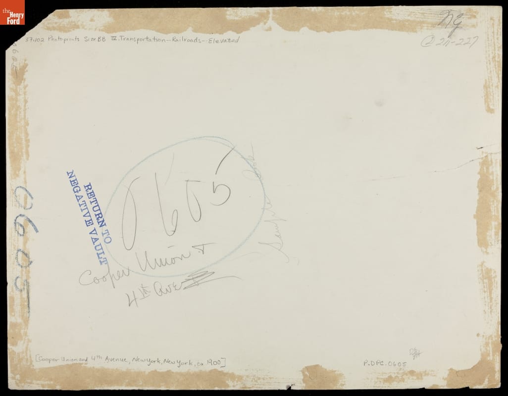 For nearly thirty years, 1895 to 1924, the Detroit Publishing Company was one of the major image publishers in the world. The company had a wide-ranging stock of original photographs, including many scenes from across North America. Here, trains run on an elevated railway above a commercial New York City street.