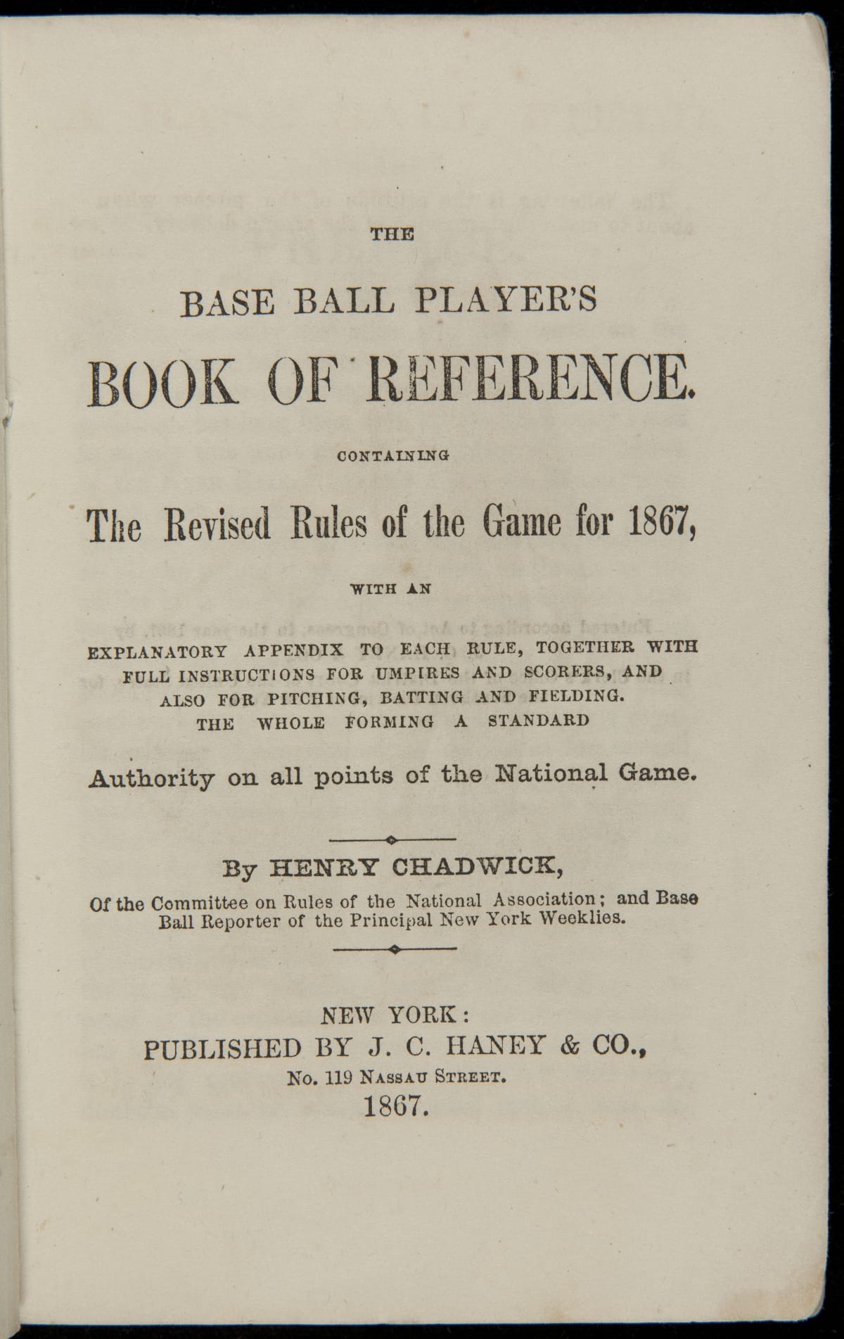 Henry Chadwick was a sports journalist and leading promoter of early baseball. He regularly wrote about baseball and helped develop standard rules for the game. Chadwick's 1867 reference helped teach the game to interested audiences and set rules for teams to follow. The twenty-four clubs who competed in the 1867 World's Tournament of Base Ball, held in Detroit, used it as the official rulebook.