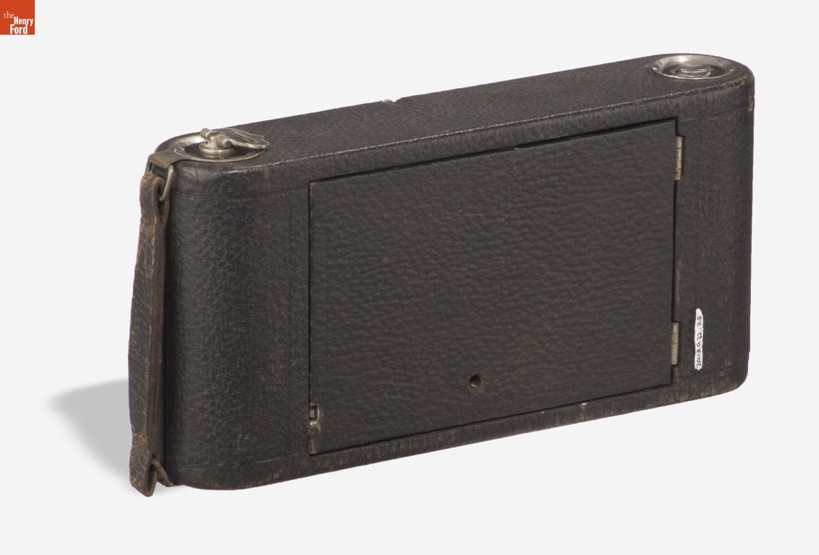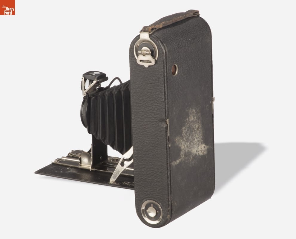 Folding cameras were designed to be portable and rugged. The lens sits at the end of a collapsible bellows system, often adjustable to provide better focus. The camera's back typically contains 120 roll film, with multiple exposures on a roll. Popular from 1900 until the introduction of 35mm film in 1945, many amateur photographers owned cameras like this.