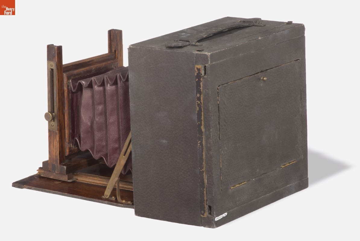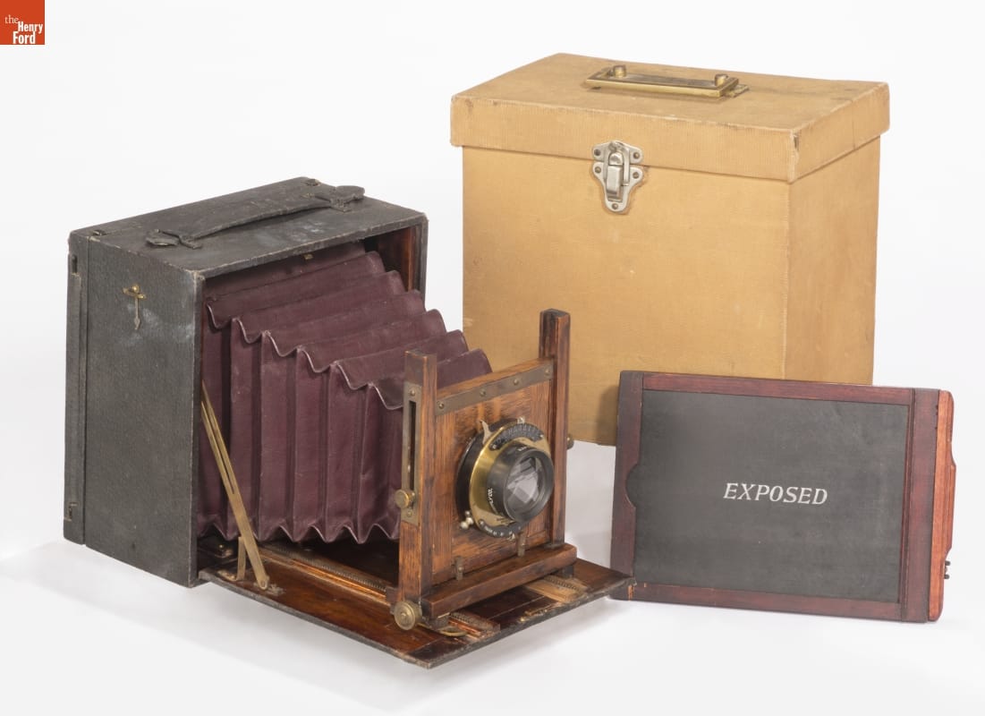 Folding cameras were designed to be portable and rugged. The lens sits at the end of a collapsible bellows system, often adjustable to provide better focus. The back of this camera held glass plates for exposure; some models contained cartridges with multiple plates. Once user-friendly roll film cameras were perfected around 1900, plate cameras began to wane.