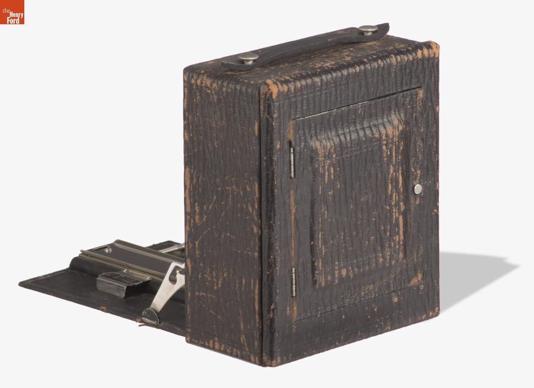 Folding cameras were designed to be portable and rugged. The lens sits at the end of a collapsible bellows system, often adjustable to provide better focus. The back of this camera held glass plates for exposure; some models contained cartridges with multiple plates. Once user-friendly roll film cameras were perfected around 1900, plate cameras began to wane.