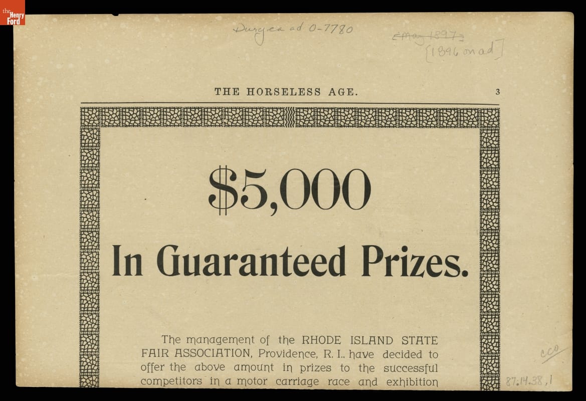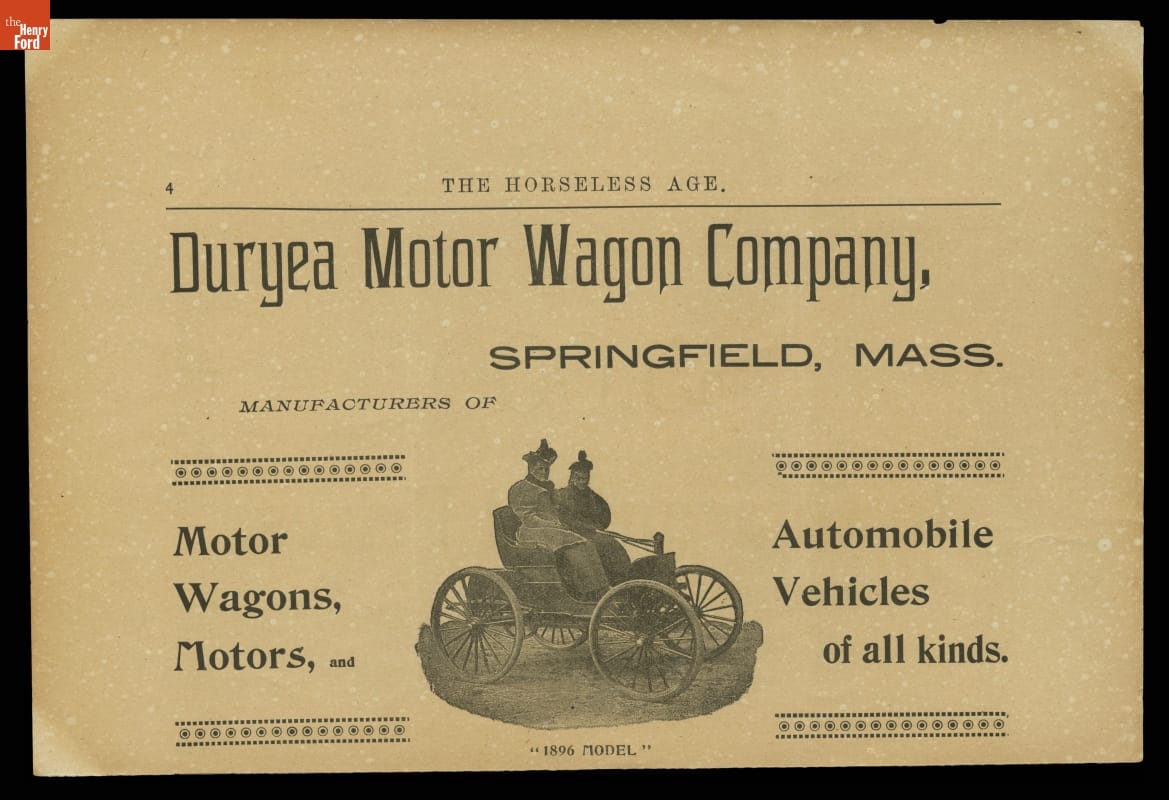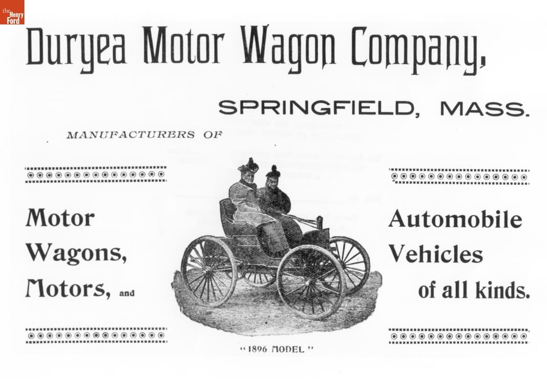 This 1896 ad promoted the Duryea Motor Wagon Company. Duryea became the first in America to produce a series of identical vehicles, an accomplishment that marked the beginning of the U.S. auto industry. They made 13 vehicles in their first year.