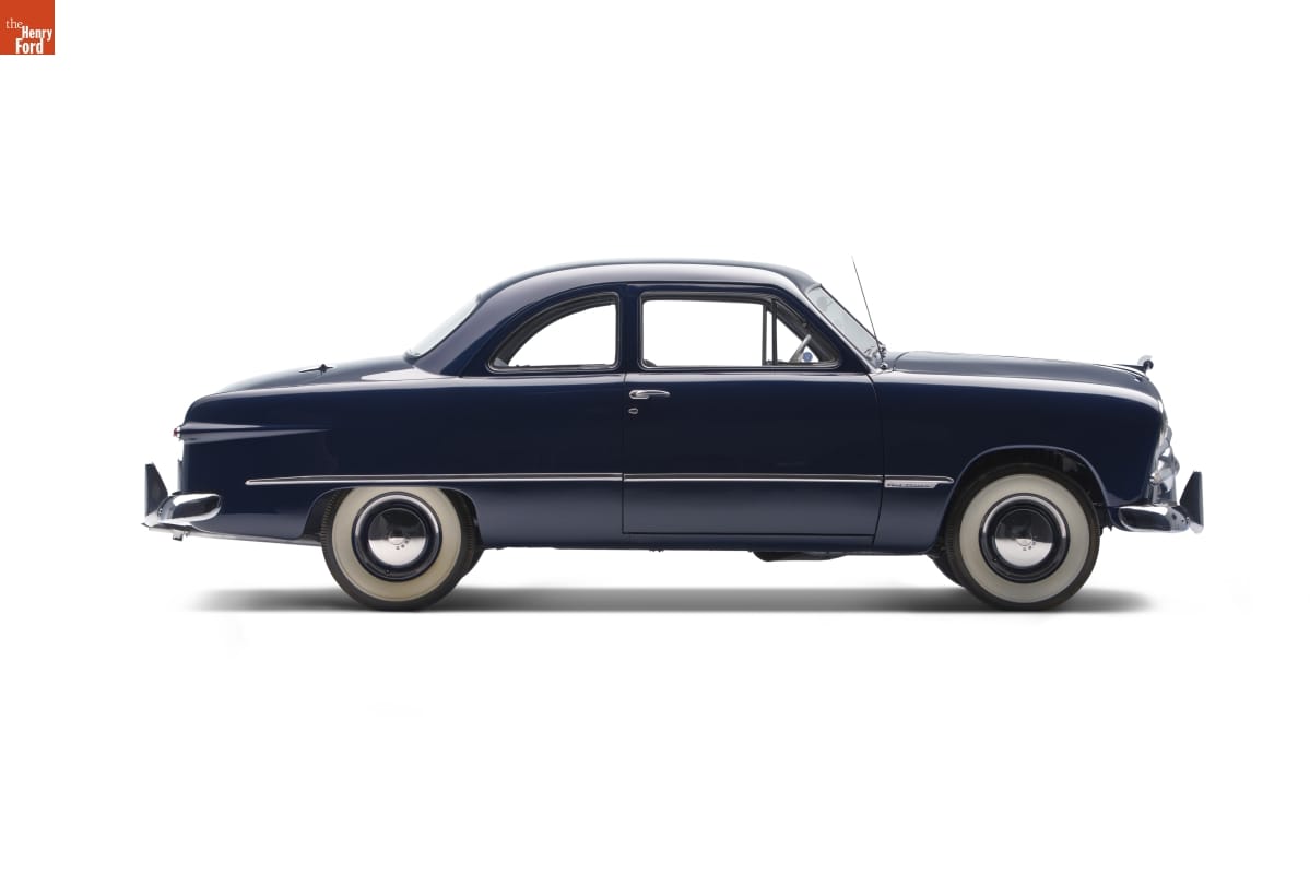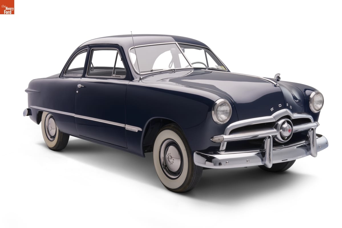 Ford's 1949 model was the company's first all-new car after World War II. The car's "envelope" body, with integral fenders and smooth slab sides, was a fresh break from previous designs. The "spinner" in the center of the grille suggested an airplane propeller, and it was an early example of the aviation themes that characterized postwar American cars.