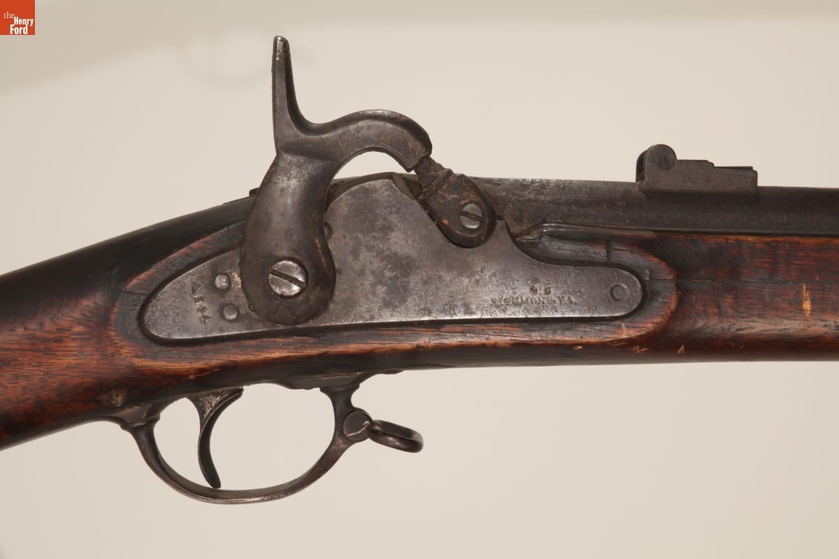 During the Civil War, the Confederate capital of Richmond, Virginia, was also a center of arms manufacture for the South. At Richmond's armory, workmen made rifles like this one on machinery taken from the United States armory at Harpers Ferry, Virginia. This captured machinery turned out near-copies of the U.S.-model rifles made in the Federal armories in the North.