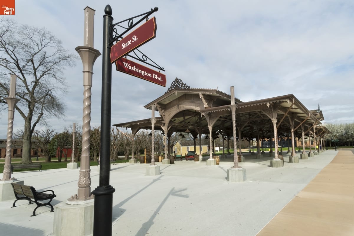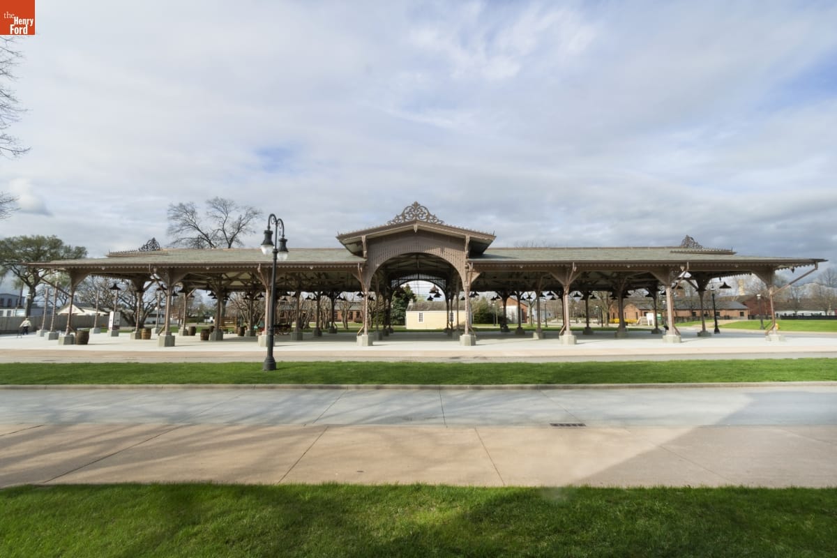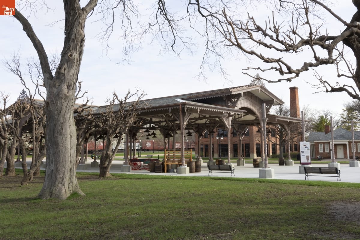 The Detroit Central Market's vegetable shed sheltered vendors and customers from 1861 to 1894. The structure was then removed to Belle Isle and was slated for demolition in 2003 when The Henry Ford acquired it. The reconstructed building--which opened in Greenfield Village in 2022--includes several original cast-iron columns and ornamental woodwork, siding, and other details that convey the Swiss-Chalet aesthetic of the original design.
