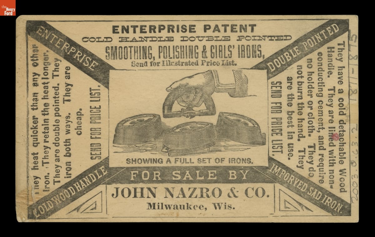 Trade Card for Mrs. Potts' Cold Handle Sad Iron, John Nazro & Company, circa 1880
