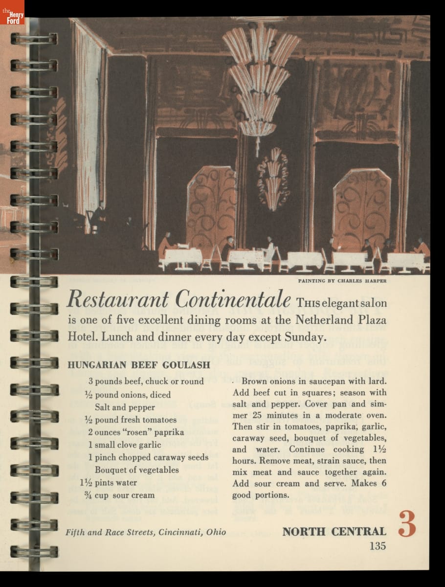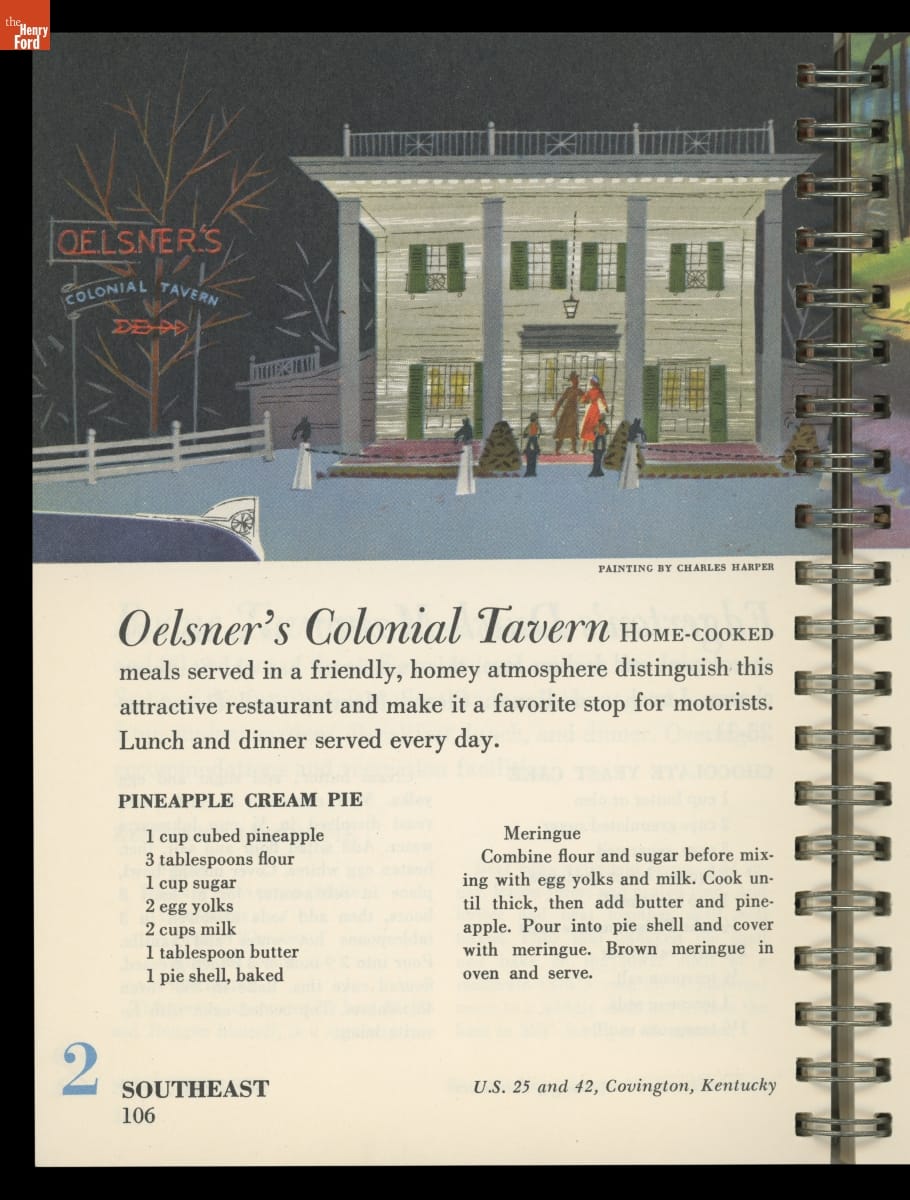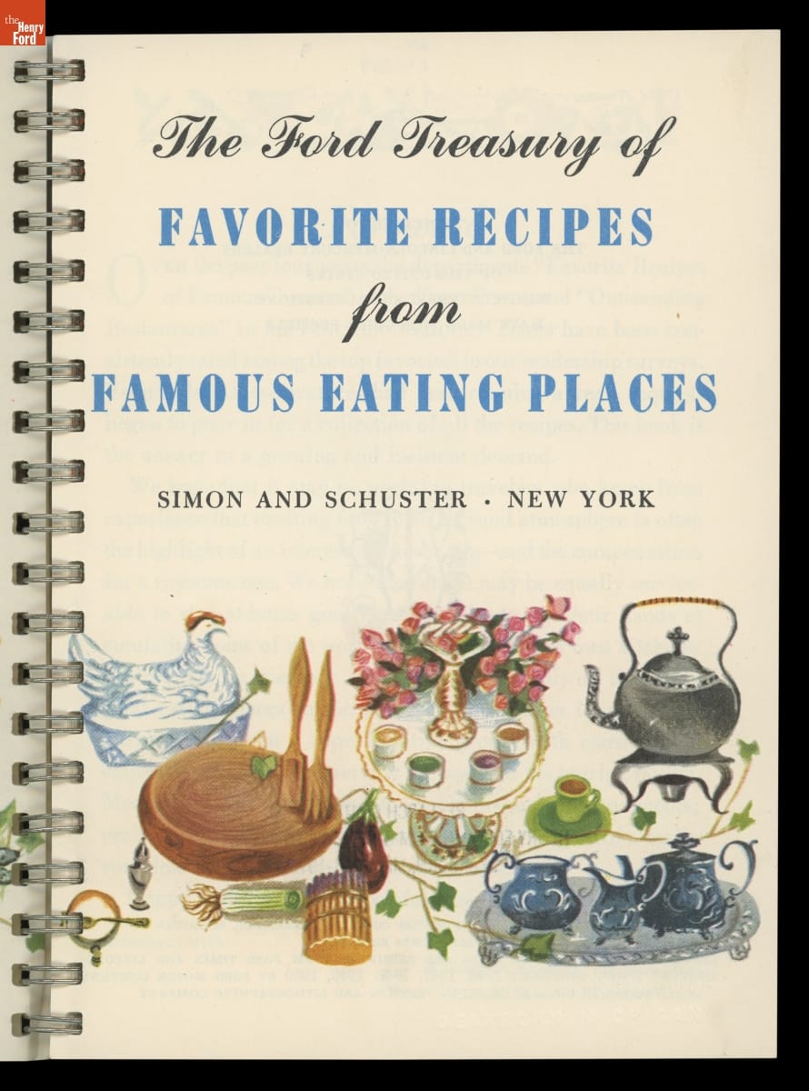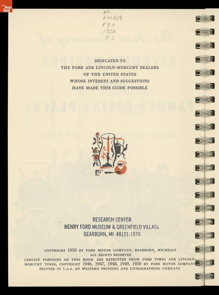 A Ford Motor Company recipe book might seem unusual, but the automaker appealed to customers through wide-ranging marketing efforts in the post-World War II era. Beginning in 1950, writer and food critic Nancy Kennedy compiled recipes from Ford's promotional magazines, Ford Times and Lincoln-Mercury Times, in a series of recipe books. These "Treasuries of Favorite Recipes" spotlighted noteworthy American restaurants.