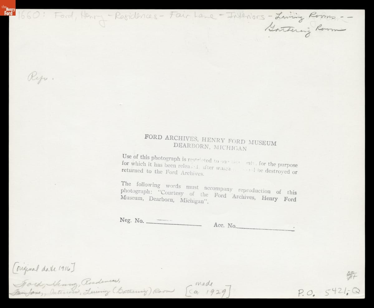 Living Room at Fair Lane, Home of Henry Ford, March 1916