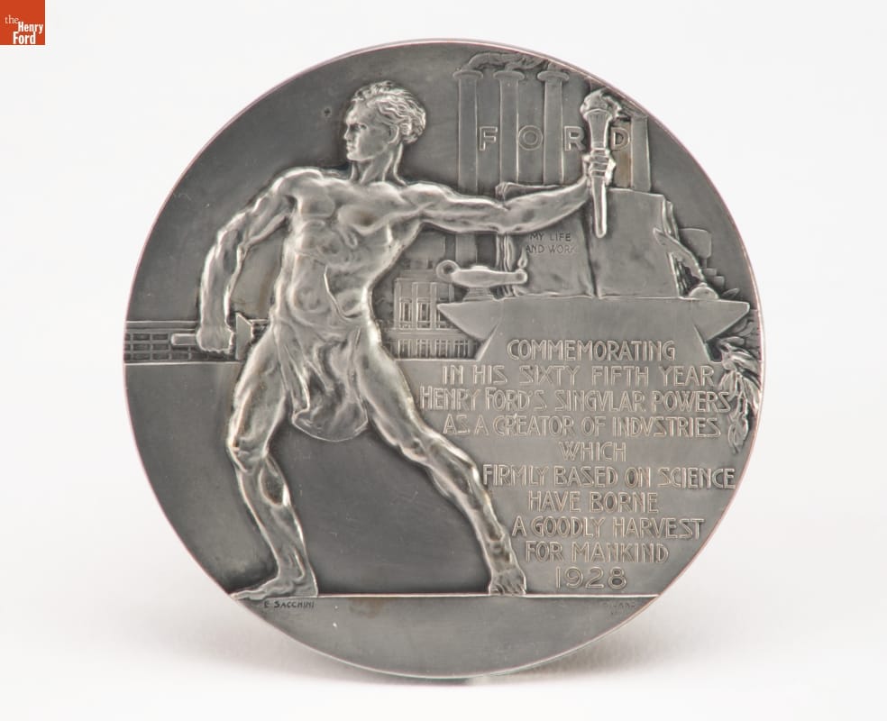 COMMEMORATING / IN HIS SIXTY FIFTH YEAR / HENRY FORD'S SINGULAR POWERS / AS A CREATOR OF INDUSTRIES / WHICH / FIRMLY BASED ON SCIENCE / HAVE BORNE / A GOODLY HARVEST / FOR MANKIND / 1928 [front]