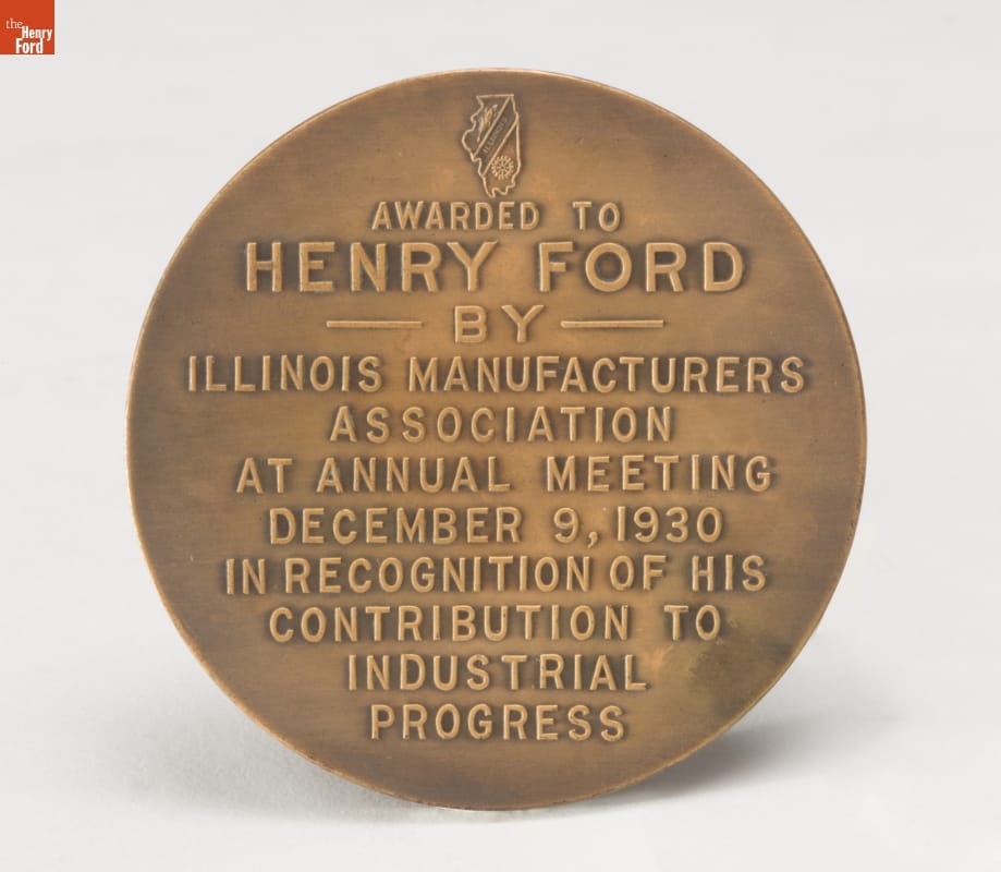 Henry Ford was recognized as more than an automotive industrialist; throughout his many years in the public eye he was acknowledged by many civic and corporate associations. This medal was awarded to Henry Ford by Illinois Manufacturers Association at their annual meeting in 1930, recognizing his contributions to industrial progress.