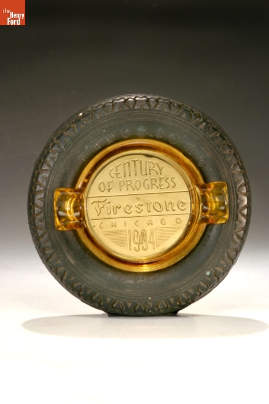 Chicago's 1933-34 Century of Progress Exposition used the theme of progress to buoy national optimism during the Depression's darkest years. The fair also provided the opportunity for companies to show off their achievements to millions of people. This souvenir ashtray embodied Firestone's featured product at the fair: rubber tires.