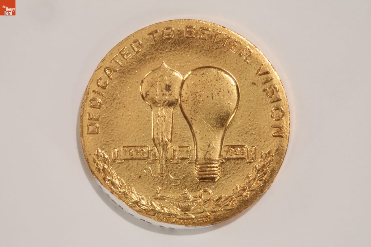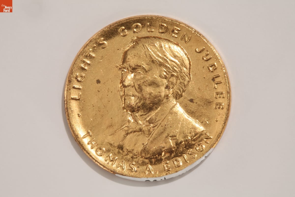 In 1929, communities throughout the United States celebrated the 50th anniversary of the incandescent electric lamp and honored its creator, Thomas Alva Edison. Organizers planned Light's Golden Jubilee events and issued commemorative souvenirs, like this medallion designed by artist Julio Kilenyi.