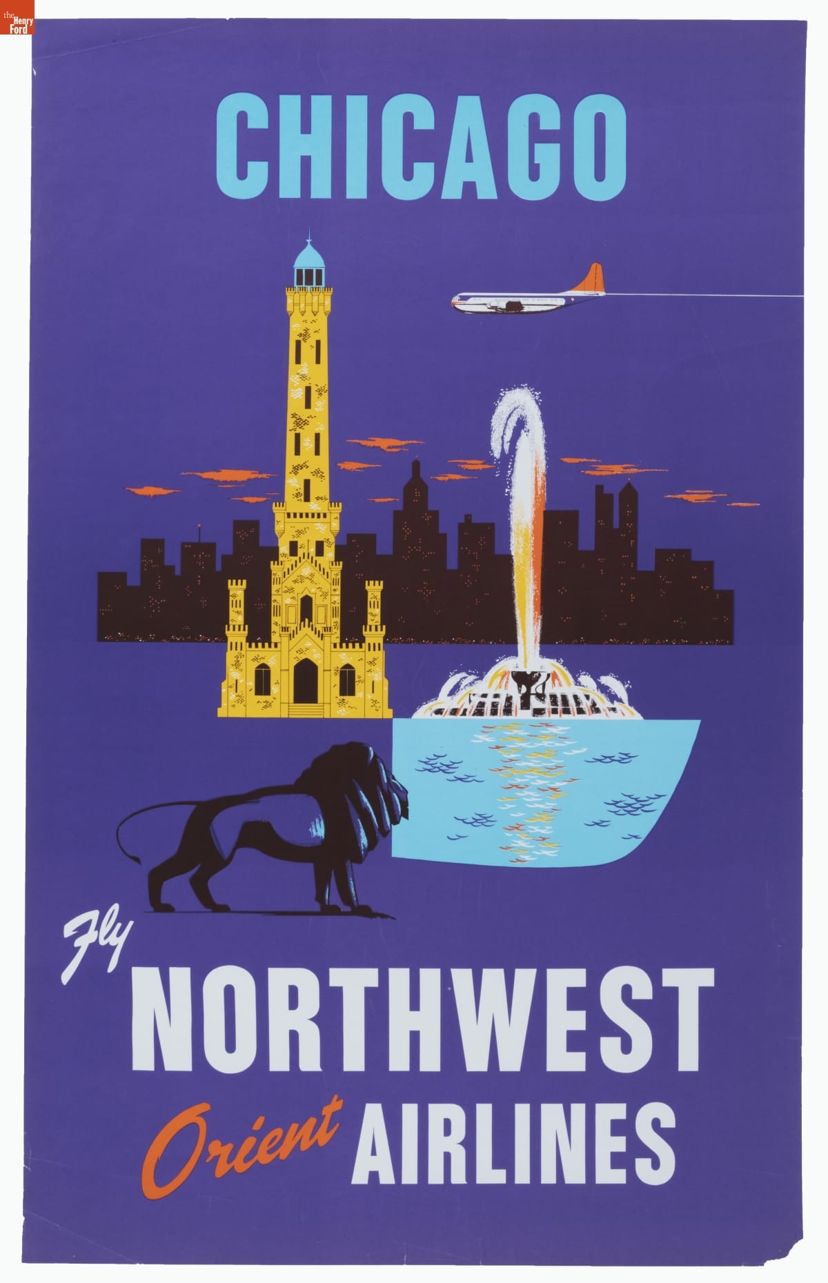 Through the 1950s, air travel retained a sense of glamour and sophistication. Some of that excitement was due to sleek travel posters advertising fashionable destinations. This poster, from Northwest Orient Airlines, promoted attractions in Chicago, Illinois, like the city's landmark 1869 water tower, Buckingham Fountain, and the Art Institute of Chicago.