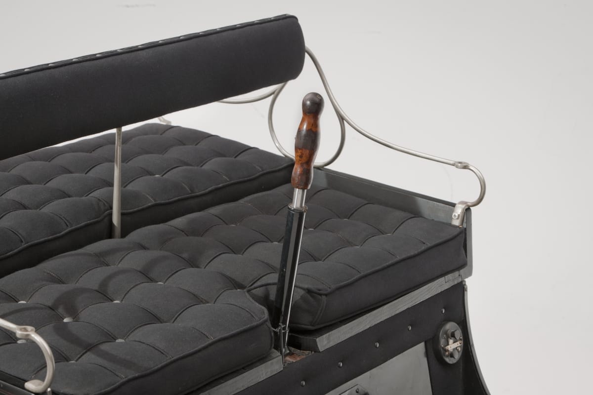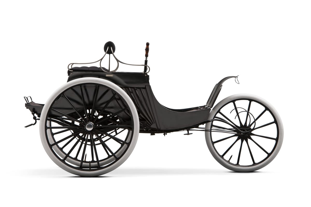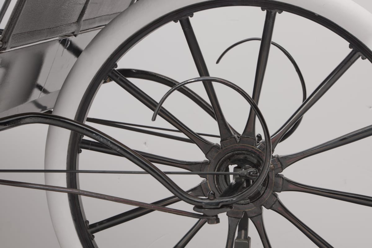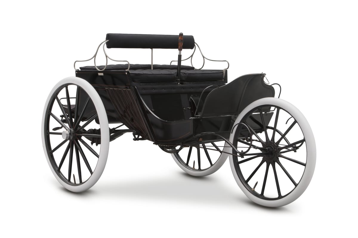 Cars of this era usually looked like squarish horse-drawn buggies. But Charles Duryea was inspired by the more graceful curves of a victoria carriage. The curling front forks support the single front wheel and flex to absorb jolts. The driver used a control stick to steer, shift gears, and accelerate. The automobile may have looked good, but passengers sat back to back, making conversation difficult.