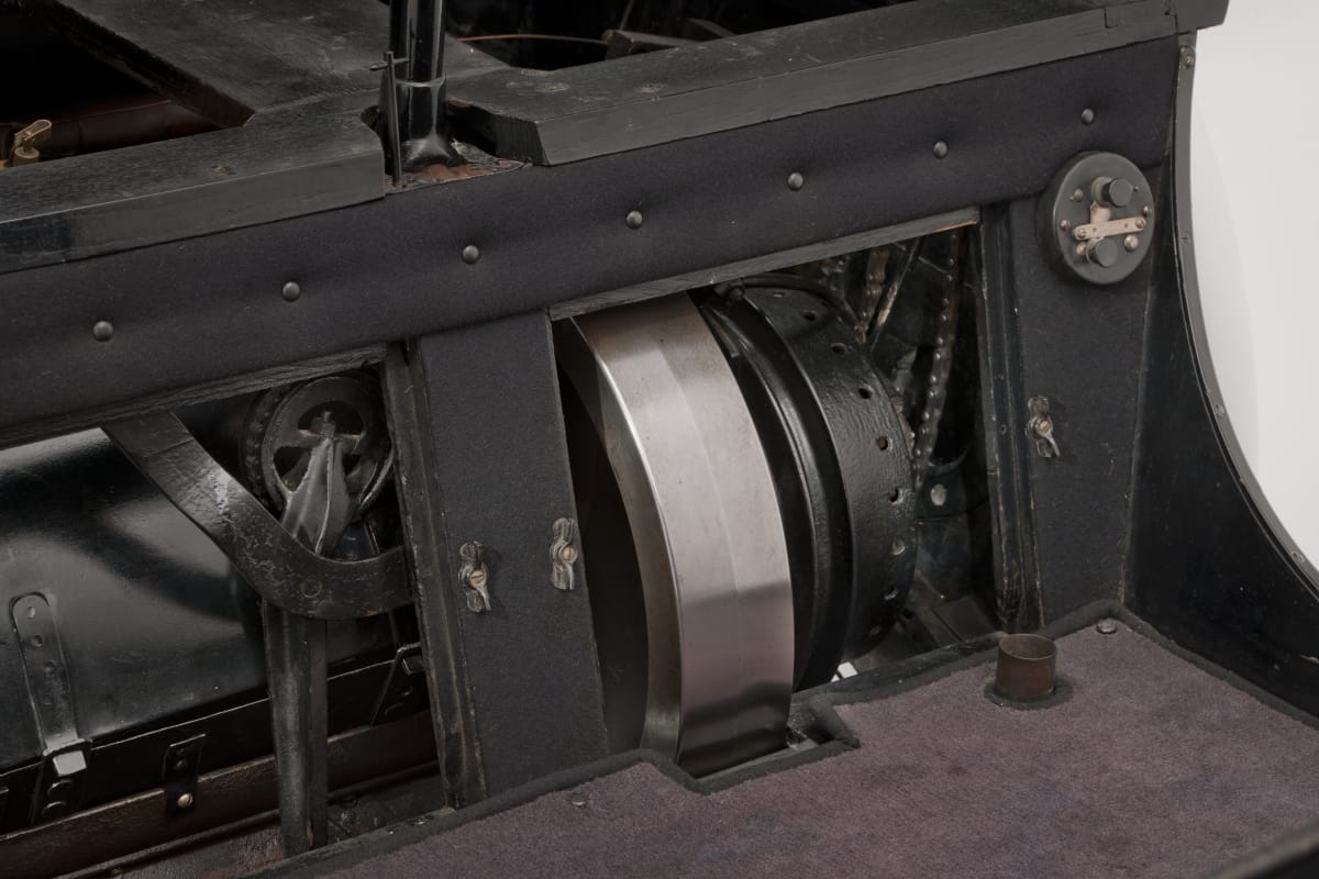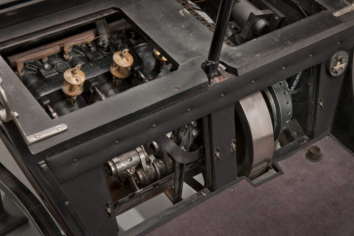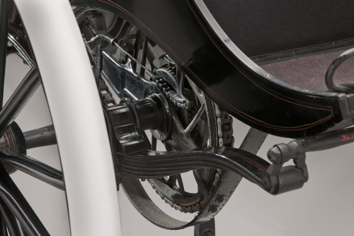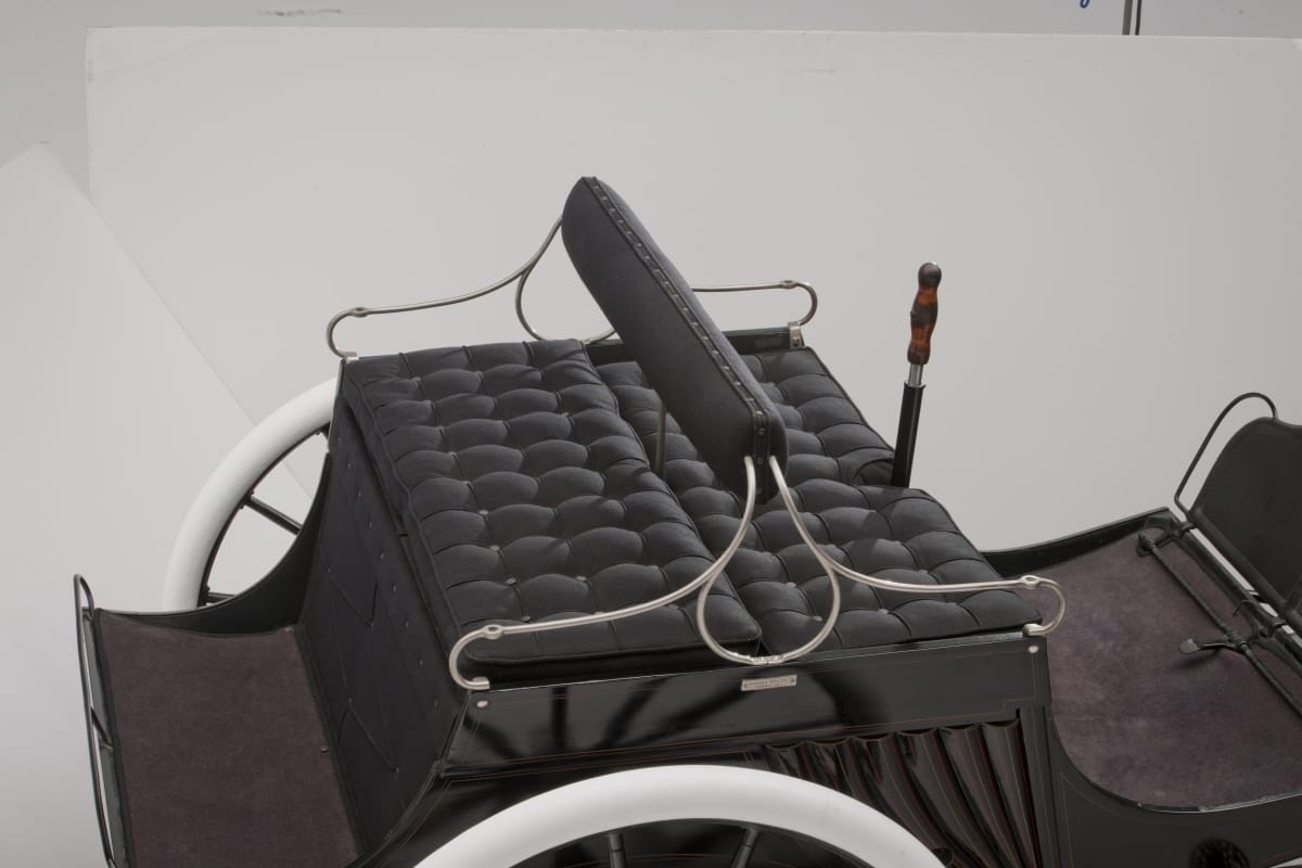 Cars of this era usually looked like squarish horse-drawn buggies. But Charles Duryea was inspired by the more graceful curves of a victoria carriage. The curling front forks support the single front wheel and flex to absorb jolts. The driver used a control stick to steer, shift gears, and accelerate. The automobile may have looked good, but passengers sat back to back, making conversation difficult.