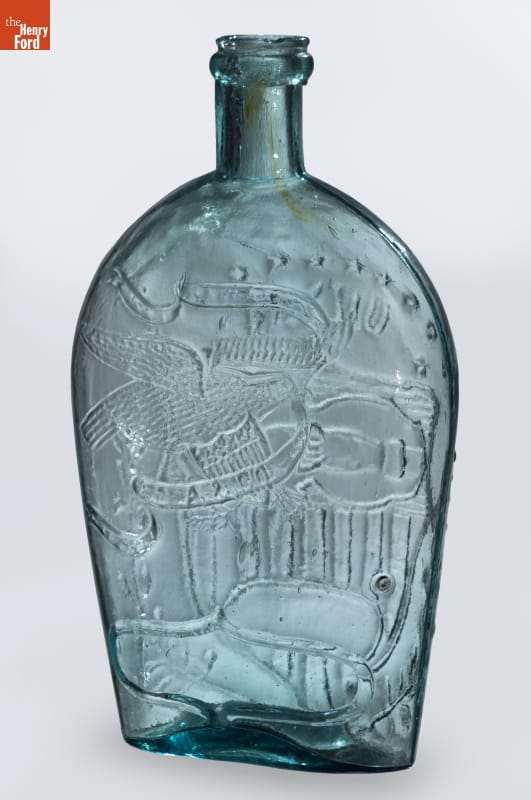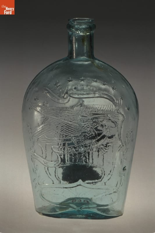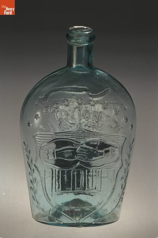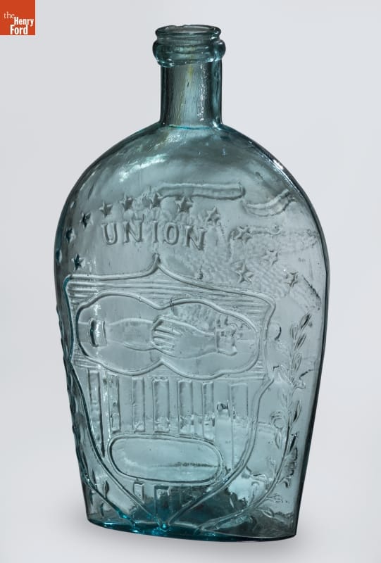 Glass factories in America began producing inexpensive, mold-formed flasks in the early 1800s. These figured flasks, often decorated with symbols of national pride or political or cultural affiliation, appealed to America's common man. The clasping hands, shield and eagle represent the Union -- a cause many Americans fought to uphold during the Civil War.
