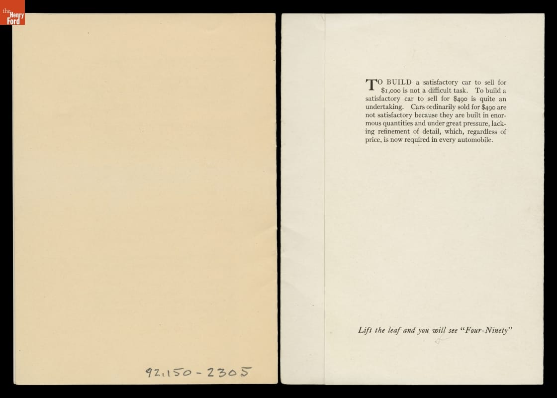 Chevrolet's 490 model, introduced for 1916, took its name from its starting price of $490 for the touring car version. That price put the 490 into direct competition with Ford's top-selling Model T, which started at $440 for a touring car. For Chevrolet's slightly higher price, customers got slightly more horsepower and a sliding-gear transmission rather than Ford's planetary gearset.