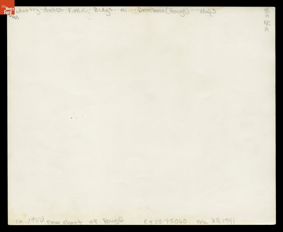 Inscribed into image at upper left corner: RIVER ROUGE / HERE IS FLOW CHART OF PLANT/ FROM ORE TO AUTO. COMPLETE / CAR CAN BE BUILT IN 28 HOURS"