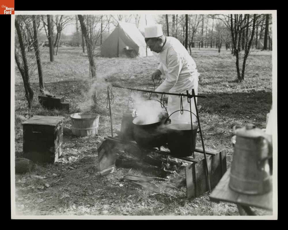 Between 1916 and 1924, Henry Ford, Thomas Edison, Harvey Firestone, and John Burroughs embarked on a series of camping trips. They called themselves the Vagabonds, yet they brought along numerous support staff to maintain camp, including Ford's personal chef, Thomas Sato. Years later, Ford recreated the trips on the grounds of Greenfield Village in memory of his friends. He invited Sato back to cook some meals.