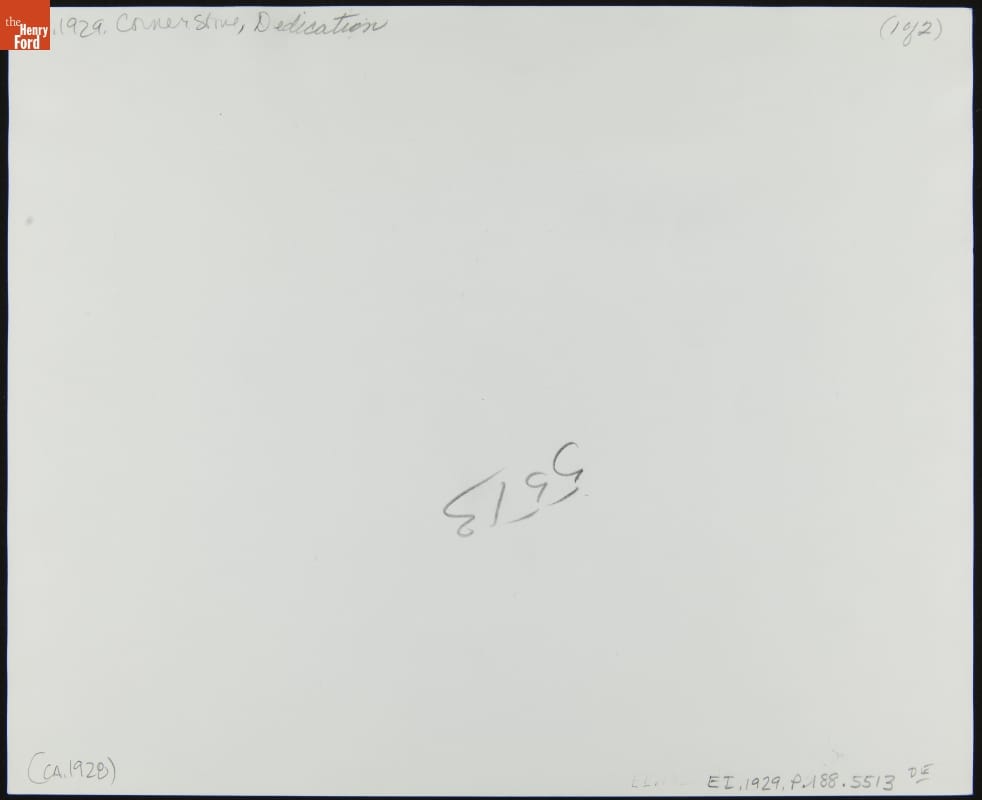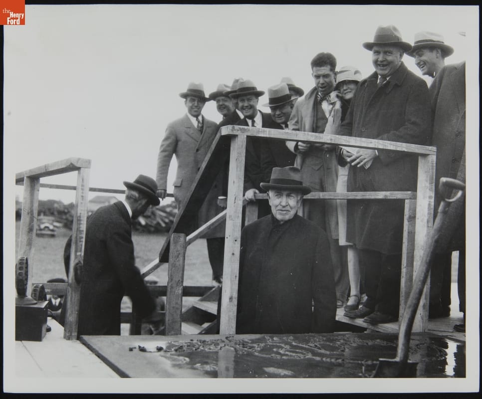 September 27th, 1928, on the future site of Henry Ford's new museum, famed inventor Thomas Edison placed a spade once used by legendary horticulturist Luther Burbank into a block of freshly poured Portland cement. Ford looked on as his friend and personal hero wrote his name in the wet cement, officially dedicating Henry Ford Museum--where this "cornerstone" is now displayed.