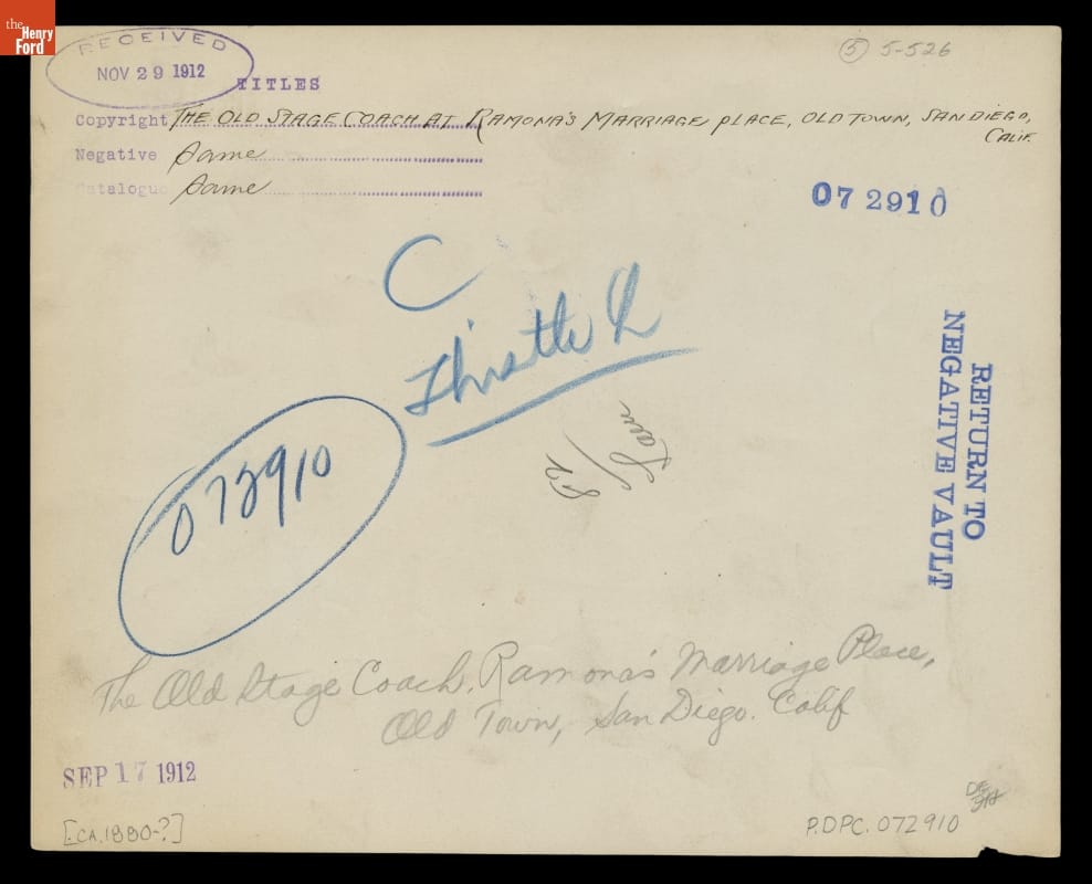 Ink stamp reads: Titles Copyright : The Old Stage Coach at Ramona's Marriage Place, Old Town, San Diego, Calif | next line: Negative same | Catalogue same