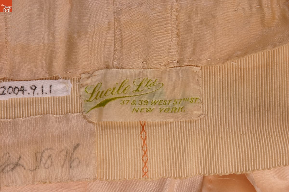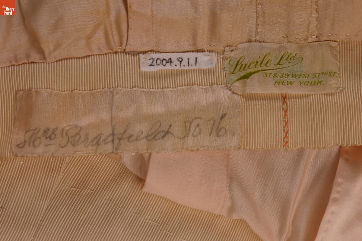 LUCILE LTD / 37 & 39 WEST 57TH ST. / NEW YORK [tag inside waist] 586.98 BRADFIELD NO. 76 [written in pencil in waist, by tag]