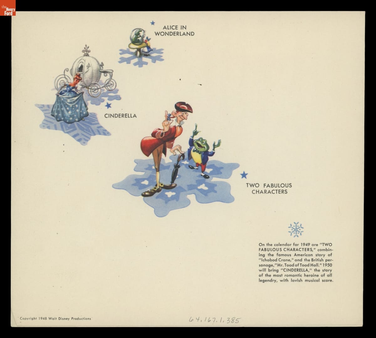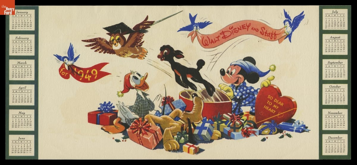 Walt Disney and Walt Disney Productions created yearly Christmas cards to send to friends and close business associates. Beginning in 1943 and for decades after, these cards featured a calendar of the upcoming year along with familiar characters and images promoting new film releases and projects. Henry and Clara Ford received cards from Disney during the 1940s.