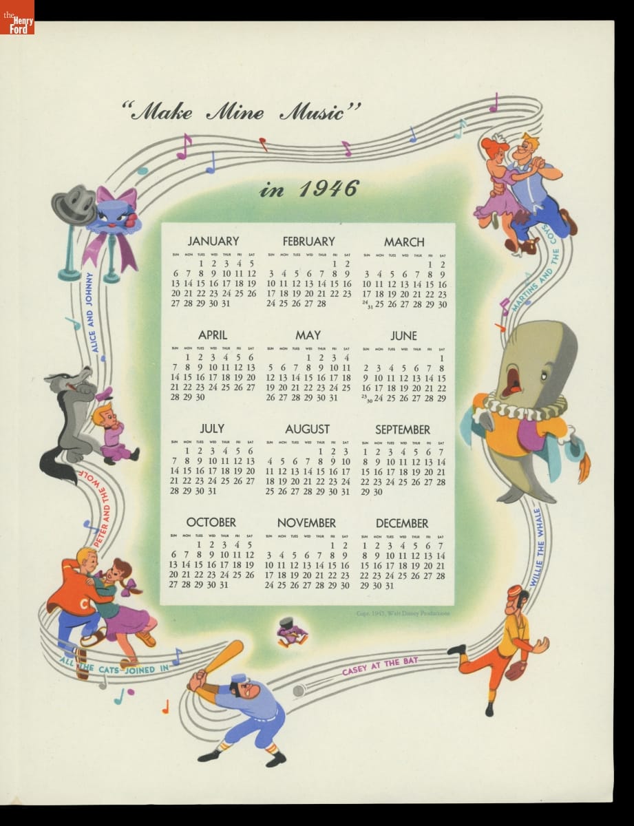Walt Disney and Walt Disney Productions created yearly Christmas cards to send to friends and close business associates. Beginning in 1943 and for decades after, these cards featured a calendar of the upcoming year along with familiar characters and images promoting new film releases and projects. Henry and Clara Ford received cards from Disney during the 1940s.