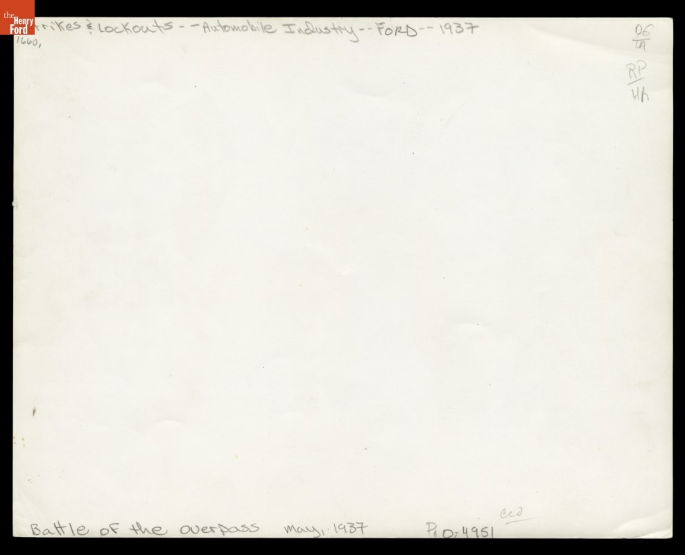 Ford Motor Company refused to recognize the United Auto Workers labor union and hired guards to resist unionization among Ford employees. In May 1937, men from Ford's Service Department attacked labor organizers on a pedestrian overpass at Ford's Rouge Plant, beating several men and women. This bloody "Battle of the Overpass" became a lasting symbol of the American labor struggle.